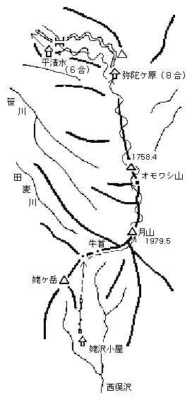 | 東北 / 弥陀ケ原へ 1981年5月5日〜6日 メンバ:高野、今野 5月5日 晴れ 姥沢 → 鍛冶小屋 吾妻連峰での山行は無事に終わり、他のメンバーと分かれて山形から姥沢行きのバスに乗る。「サマースキーの月山」といわれるだけに雪はたっぷりとある。姥沢小屋で身仕度をしてリフトに乗り、終点でシールを着け、登り出す。 紫灯森から見える湯殿山スキー場へのコースもなかなか良さそうで滑り出したくなる。ゲレンデからリフトの最終を告げる「蛍の光」が流れてきて、最後の登りとなる。鍛冶小屋のところに荷をデポして上の様子を見に行くが、風が強く目を開けていられないほど、鍛冶小屋の前にツェルトを張る。今回は軽量化をねらってスコップを持ってこなかったので、スキー、コッフェルを使って幕営地作りをした。 【コースタイム】 姥沢 15:00/16:00 → 鍛冶小屋 18:10 5月6日 晴れ 鍛冶小屋 → 羽黒口 昨夜は風の音で暫く寝付かれず遅い出発となる。連休中は人がいるという頂上小屋もひっそりして、誰もいない。神社の後ろから北東の方に続く尾根に沿って滑る。なだらかな大斜面でのんびり滑るうちに仏生小屋に着く。まだ大方雪の中で屋根だけが見える。小屋の先の1758mのピークを回り込むと眺望が開ける。まさに大斜面。尾根筋は土の出ているところも有るが他は一面雪で快適に飛ばす。弥陀ケ原の小屋も雪の中で鳥居が頭を出していた。月山高原レストランハウスの前に滑り込み、さらに北へと滑り出すが、あまりにも快適な滑りに藤島川の源頭の方に滑り込んでしまう。 シールを着けて30分ほど登り返して、道路らしきところに登り、そこより沢に滑り込む。この辺に来ると何本かトレールが付いている。平清水の小屋は出ていて中に入る。ゴミの山が有るがまあまあ奇麗な方でここをベースにするのも良いようだ。あとはバス道路に沿って下るが樹林の中に入るとネバネバした新芽の殻(?)らしきものがスキーにブレーキとなって滑らなくなる。除雪されたところでスキーを外し長い歩きとなった。 【コースタイム】 鍛冶小屋 8:40 → 月山山頂 9:00 → 月山レストラン 10:20 → 平清水 11:20/12:00 → 羽黒バス停 15:10 記:今野、電子化:作野 【概念図】 |