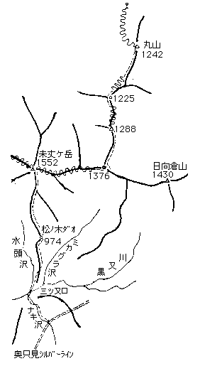 | 会越 / 奥只見丸山へ 1982年4月23日〜24日 長谷川 単独 4月23日(金) 快晴 [三つ又口〜未丈ヶ岳] 奥只見シルバーラインが8時まで通行止めなのを知らず、朝早く起き出してしまい、小出駅で時間を持て余してしまった。トンネル途中ので口でタクシーを降り、ナキ沢(オソノ沢へ出る。軽快な服装をした熊狩の猟師の姿を見かけた。 先行者の踏み跡を辿り、スノーブリッジを何回か渡って三つ又口につく。猟師の足跡は、水頭沢の方へ向かっていた。 尾根は雪が消えて夏道が出ていたが、まわりの薮にスキーが引っ掛かって歩きにくい。松ノ木ダオより鞍部へ下り、暫く登り返すとようやく残雪が続くようになった。スキーをザックから外し、引張って歩く。振り返ると、正面には真っ白に残雪を残した越後駒が、その左には屏風のようにピークを連ねた荒沢岳が、堂々とした山容を見せ、目を楽しませてくれる。駒から枝折峠への尾根は、幅もありスキーには良さそうである。荒沢岳の各沢は頂上付近で急にせり上がっていて、スキーで下るのはちょっと難しいような気がする。 日頃の睡眠不足と久し振りに一泊の荷を背負ったためか、ピッチが上がらず、頻繁に休みをとってしまう。1204mピークより右手の尾根が合わさる付近まで、やや広い雪原になっており、この尾根では唯一スキーが楽しめそうな所だ。痩せた尾根を進み、潅木を避け右より巻くと、広い雪原に出た。未丈ヶ岳の頂上である。谷を隔てて、朝日から駒へ続く南会津の山並みや燧ケ岳の姿が見渡せる毛猛山の後ろには、白く霞んだ浅草だけの姿も見える。初めて見る山々の展望を楽しんだ後、北面のゆるやかな斜面を一滑りしてみた。 【コースタイム】 ナキ沢トンネル出口 8:25 → 三つ又口 8:55/9:05 → 松ノ木ダオ 10:50/11:10 → 1204mP 12:40/55 → 未丈ヶ岳山頂 14:30 4月24日(土) 快晴 [未丈ヶ岳〜奥只見山] 日も大分高くなってようやく起き出した。珍しく山の中で十分な休養が取れた感じだ。出発準備をのんびり終えた頃には、雪も程よく緩んでいた。 頂上より日向倉山へ続く尾根にスキーを走らせる。スキー滑降が十分出来る広さがあるが、所々亀裂が走っていて神経を使う。1376mPへの登りは雪がズタズタに切れていて、薮と残った雪塊の上を交互に登る。ピーク直下にも大きな割れ目が走っていて直接下れず、南側を大きく回り込んで円山への尾根に出る。1288mPより再びスキーを着ける。最初は快適なシュプールを描くことができたが、だんだんと痩せてきて、尾根のすぐ脇を斜滑降・横滑りで下る。 1225mPから尾根の東側をトラバースし、小尾根を乗越すと、ゆるやかに起伏した広大な雪原が現れた。丸山スキー上のリフトが間近に見える。振り返ってみる未丈ヶ岳は、左右に白くゆるやかに尾根を伸ばし、端正な姿を見せている。この山は、丸山側から見た方が見栄えがする。リフトを横目に、シールで丸山まで登る。山頂は春スキーを楽しむスキーヤーでいっぱいであった。山行を終わってほっとした気持ちと同時に、静かな一人旅のフィナーレには似つかわしくないような気分がした。 【コースタイム】 山頂出発 8:35 → 1376mP 9:35/45 → 1288P 10:25/30 → 雪原の入り口 11:20/35 → 丸山 12:10/20 → スキー場下 12:40 記:長谷川、電子化:作野 【概念図】 ![]() |