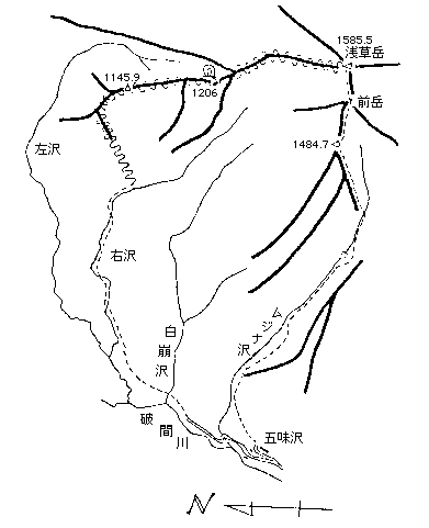 | 会越 / 早坂尾根 1982年4月17日〜18日 CL:陶山、SL:菅沼、M:田中、高野、針谷、今野 古川、伊藤久、蔵田、角田 4月17日(土) 小出 → 早坂尾根1200m タクシー3台に分乗して、浅草山荘前まで歩かずに入れる。スキーにシールをつけ、身仕度を整え、山荘の横手の沢より登りはじめる。沢の入口近くでは、つぼ足の踏み跡も見られ、所々にミッチェルもついている。 初めはわりにゆるやかで、ちょっと急な斜面をジグザグに登って、台地状の所へ出て休憩。それから尾根をまわり込んでどの辺でムジナ沢へ降りるのかなというかんじ。 ルート図集に書いてあった目印のブナの木というのはよくわからず、沢の左岸を少し高くトラバースぎみに行き、途中から沢へおりるが、転んで少し滑落した人もいてドキッとする。沢におりても、登りはあいかわらず片側の斜登行で、くるぶしの下の方に靴ズレができてしまった。時々、日が照って暑い。滝の所で休憩。滝は右手から高巻き、尾根道をジグザグに登る。少し傾斜のゆるくなった所で1本とるうち、たちまちガスが広がり、風も強く寒くなって、あわててヤッケを着込む。1484.7ピークから先は、一部稜線が細くなっているので、スキーをザックのサイドにつけて越す。 そこから先は、サイドにスキーをつけたままの人、ひきずって歩く人と様々で、前岳まで。そこで再び少し休憩をとり、浅草岳へほんのひと登り。山頂は一部土が出ている。 記念写真をとったりの大休止の後、いよいよ本日の初すべり。雪はアイスバーンぎみで、ゆるい斜面であまりデコボコもなく、何とかこなせるが、足にビンビンひびく様な感じであまり快適ではない。所々で人数を確認しながら、皆、広い斜面を思い思いすべって、あっという間に、テントサイト予定地へ到着。そこで、3時間かけて、立派な雪洞をつくり、少し広すぎて寒い位ではあったが、夜降りつもった雪も、風も苦にせずの快適な住いとなった。 【コースタイム】 小出 6:00 → 浅草山荘 6:50/7:25 → 800m台地 8:30/40 → 滝 9:50/10:05 → 1484.7ピーク 11:00/25 → 前岳 12:25/35 → 浅草岳山頂 12:45/13:30 → B.C(1200m) 13:50 4月18日(日) 昨日おりて来た尾根を登りかえしてもう一度すべろうと出発したが、アラレのような雪の吹雪模様で、30分位登ってひきかえす。昨晩からの雪が所々つもった部分は若干すべりやすいが、その他はあいかわらずのアイスバーンぎみ。パッキングをしてBCを後にする。だだっ広い尾根を進み、途中の尾根から降りれればと様子を見るが木の混んだ急斜面なので結局、ゆるい尾根の末端近くまで行き降りる。一部ヤブを横切りコースへ出る。後は林道まで一気に降り、そこで休憩、そしてまだ雪にうまった林道ぞいにすべってゆく。トップはすべらないが、後は何とかすべるような状態。橋の付近は雪が消えていて、スキーをはずしたり、つけたりめんどうくさい。途中でもう1回休憩し、最後は少しスキーをかつぎ音松荘へ。 (蔵田 記) 【コースタイム】 B.C 6:55 → 折り返し点 7:30/45 → B.C 7:55/8:40 → 1480m 9:00 → 林道 10:00/15 → 左沢・右沢合流点 11:05/25 → 音松荘 12:05/13:05 【概念図】 ![]() |