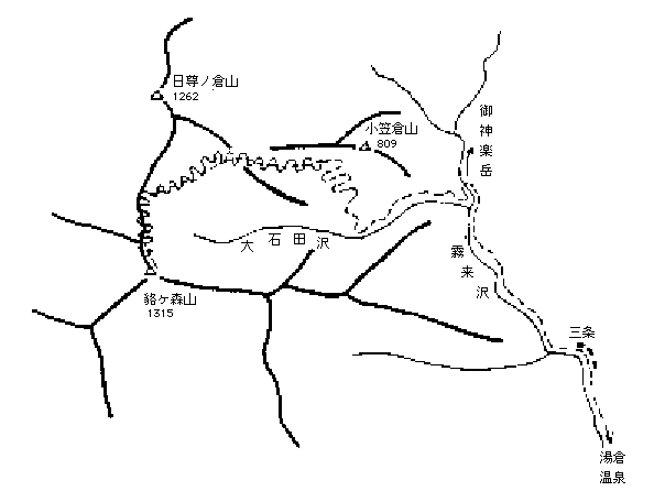 | 会越 / 1982年5月4日 メンバー:長谷川、小森宮 5月4日(火) 小雨後曇り 会津駒の山行後、私と小森宮氏の2人は会越国境の貉ヶ森山へ登ることにした。只見線の本名で下車し、湯倉温泉で一泊する。落ち着いた感じのこざっぱりした宿で、我々以外はほとんど釣りの客で占められていた。 6時過ぎに宿を出発し、木の吊り橋を渡って只見川支流霧来沢沿いの林道を行く。昨夜の雨で雪解けが進んだためか、水が激しい勢いで流れている。あいにくと、また雨がぽつりぽつりと降ってきた。傘を広げたり、カッパを羽織ったりして、のんびり歩く。三条の部落は、崩れた廃屋が目立つ。観光ブームとは無縁な奥深い山村の宿命なのだろうか。釣りの車が何台か追い越していった。自家用車で来れば、この長い林道歩きから解放されるのだが。 林道は大石田沢を離れ、小笠倉山の尾根に向かってくねくね曲がりながら高度を上げている。天気も持ち直し、見透視も良くなってきた。800mを越えると、待ち望んだ雪が現れた。植林後間もない杉林はほとんど雪に埋まり、広い雪原になっている。林道を離れ、真っ直ぐに1011mP下のコルを目指して進む。コルを過ぎると、初めて貉ヶ森山が姿を現した。緑深い山々の中にあって、雪白き山の形容がぴったりする山容である。 入り組んだ雪原を突っ切って、日尊の倉山とのコルのすぐ左の枝尾根に取り付く。稜線は思ったより広く、快適なスキーが楽しめそうだ。高度を上げるに連れて、黒い山肌に斑雪を残した御神楽岳の姿が大きく浮かび上がってくる。真っ白な山とはまた違った趣がある。頂上手前のピークでザックを降ろし、1315mの一等三角点を往復する。雪の消えた薮の中に標石と山頂を示すプレートを見つけた。おそらく再び踏むこともない山頂の記念に、横に座って写真を撮り合った。 デポ地点よりゆるやかな稜線を滑り降りる。所々ブッシュが顔を出しているが、それほど気にならない。登りに使った急な枝尾根を下り、トラバース気味に進むと小さな池に出会う。地図に出ている池であろうか。スキーをひきずって上り下りし、コルの手前より再びスキーを着ける。雪の上に頭だけを出した木々の間を縫うように滑り降りる。やがて、林道に出会い、標高差500mあまりのスキー滑降も終わりになる。湯倉温泉までの長い下りで、2人とも足にマメを作ってしまい、予定していた浅草岳登山を取りやめてその日のうちに帰京した。 【コースタイム】 湯倉温泉 6:10 → 三条 7:05 → 大石田林道分岐 8:00 → 林道を離れる 9:35 → 稜線 11:15 → 貉ヶ森山頂 12:05 → スキー滑降開始 12:30 → 滑降終了(800m地点) 13:15/13:30 → 分岐 14:30 → 三条 15:15 → 湯倉温泉 16:10 記:長谷川、電子化:作野 |