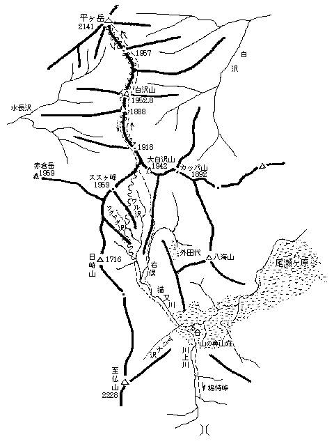| 尾瀬 / 山の鼻より 1982年4月24日〜26日 L:安達、M:陶山、川口 4月24日(土) 沼田 → 山ノ鼻 いつもの列車を沼田で下りる。連休前のせいかずい分すいていた。5時まで眠り電話でタクシーを呼ぶ。鳩待峠への道は昨年よりも雪が少なく、もちろん完全に除雪されていたが、5月1日まで通行止めになっているためタクシーは入ってくれない。仕方なく峠まで歩いたが、津奈木沢から林道に登る所は雪もなくなっていて苦労させられた。まだ営業していない鳩待山荘の前で一休みした後川上川ぞいに山ノ鼻まで下る。川のところまでは滑るがそれから先は平でほとんど滑らない。山ノ鼻も小屋が営業していないのでとても静かだ。 猫又川の近くにベースを張る。雪は1〜2mといったところ。猫又川はかなりの水量で、この付近ではとても渡れない。このあたりで渡るためには少なくても二週間くらい前に来る必要がある。 【コースタイム】 笠科ダム 7:30/50 → 笠科橋 8:45/9:00 → 津奈木橋 9:20 → 林道 9:55/10:15 → 鳩待峠 10:45/11:25 → 1460m 11:50/12:30 → 山ノ鼻 13:05 4月25日(日) 山ノ鼻 ←→ 平ヶ岳 早朝カラスに起こされて出発する。雪は硬いのでスキーを引っぱって猫又川ぞいに歩いてゆく。川は山ノ鼻から柳平付近まで湿地の中を蛇行して流れていて、どれが本流かわかり難い。トレールが残っていてもスノーブリッジが落ちている所も多くありあまりあてにできない。右よりに進路をとって川ぞいに進むと二俣にでた。右俣は雪でうまっていて歩き易く、しばらく行った所で尾根にとりついた。尾根はシールのきく斜面となり、正面に大白沢山が、振り返ると至仏山がいつもとはちがった横顔をみせる。外田代も下の方になった。尾根はワル沢よりにとり、大白沢山はススヶ峰との間を通って越えたがそれが正解だった。大白沢山から白沢山までは少し細くなって小ピークが多く右側は雪庇になる。左のゆるい斜面をまくようにして白沢山に出る。正面に平ヶ岳が大きい。小さなピークをいくつか越えて山頂につく。広々とした頂上のまわりには、越後三山を前方にして、巻機山、尾瀬、日光の山々などがずらりと並ぶ。 帰りは大白沢山までは往路をたどる。白沢山への下りは素晴らしい斜面だ。大白沢山からはススヶ峰の方にトラバースして左俣側を滑る。左俣側は全体的に斜面が急で小沢が多くあまりよい斜面でない。大白沢山からも往路を戻った方が滑りを楽しめるようだ。いずれにしても川まで下りると後は平地滑走になってしまう。うんざりしたころにベースが見えてきた。 【コースタイム】 山ノ鼻 6:30 → 右俣1450m 7:25/37 → 尾根上 1680m 8:35/45 → ススヶ峰への分岐1911m 9:55/10:10 → 白沢山 11:15 → 1920m 11:20/35 → 平ヶ岳 12:35 /13:10 → 1800m鞍部 14:00/40 → ススヶ峰への分岐 15:15/30 → 左俣 16:35/50 → 山ノ鼻 17:35 4月26日(月) 山ノ鼻 → 沼田 昨日くらいから小屋にも人が入り始めたようだ。鳩待峠までつぼ足で登る。何人かの登山者にも出会った。 峠からは雪を探して滑るがほとんど滑れない。板をつけたりはずしたりしているうちに歩いている人はどんどん先に行ってしまった。途中から津奈木橋まで滑れる所があるが、そこから先は戸倉までは暑く長い林道歩きとなった。連休前の尾瀬は天気も安定して静かでよいが、この林道歩きを考えると連休以降の車が入る頃か、いっそ林道の除雪が始まる前に来る方がよいかもしれない。 【コースタイム】 山ノ鼻 7:00 → 1500m 7:55/8:07 → 鳩待峠 8:35/55 → 津奈木橋 9:40/10:00 → 石子根沢橋 10:45/11:00 → 戸倉 12:05 (安達 記) 【概念図】 ![]() |