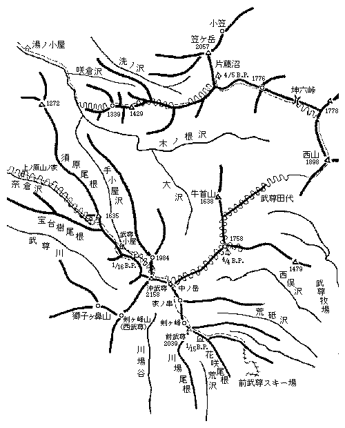| 上越 / 前武尊より上の原 1981年1月15日〜17日 メンバー:長谷川、藤谷(都職山の会) 1月15日(木) 小雪後晴れ 〔前武尊スキー場〜花咲尾根〕 豪雪による交通機関の乱れとシールトラブルとで出発が遅れ、歩き始めたのは12時を過ぎてしまった。チラチラ降っていた雪もやみ、目指す前武尊もよく見える。1665mPまではなだらかで気持ちよい尾根が続く。膝までのラッセルだが、雪は軽い。右隣の沢や尾根はスキー滑降にはよさそうである。 左の花咲尾根と合流する付近からは傾斜が増し、キックターンが苦しくなる。1850m付近の稜線で行動を中止し荒沢側の斜面に雪洞を掘る。雪は柔らかく、1時間半ほどで立派な雪洞が出来上がった。天気図では低気圧が南岸を進みそうな気配であり、明日の天気が心配された。 【コースタイム】 前武尊スキー場(第3リフト) 12:20 → 1665mP 13:45 → 花咲尾根合流点14:55 → 1850m地点(雪洞)15:30 1月16日(金) 快晴後雪 〔前武尊〜沖武尊〜手小屋沢〕 雪洞を出ると、予想に反し真っ青に晴れたよい天気である。今日は、最初から30度近い急斜面の登りである。樹林のまばらな斜面が断続的に続いていて、新雪滑降が楽しめそうな所だ。やがて斜度が緩やかになり、前武尊の山頂に着く。山頂からの展望は素晴らしい。特異な姿を見せる皇海山や日光白根。至仏や笠ヶ岳はスケールの大きな斜面をのばしている。真っ白な雪壁を持つ西武尊も魅力的だ。しかし、展望を楽しんでいる間にも谷川方面には雲がかかり始め、天候悪化の兆しが見えてきた。 いよいよ核心部の縦走に入る。最初の剣ヶ峰は東側(右側)をトラバースする。下から仰ぎ見ると、岩峰がのしかかってくるようで圧迫感を感じる。続いて、家ノ串は西側(左側)をトラバースし中ノ岳とのコルに出る。コルにつく頃には周囲はガスにつつまれ、雪も降り始めた。中ノ岳へは稜線づたいに行く。稜線に出来た大きなコブの乗越しに苦労する。中ノ岳から少し下って、樹林の比較的多い北側(右側)の斜面を進む。樹氷が見事だ。 日本武尊の像を過ぎると間もなく沖武尊の頂上である。少し下がってからシールを外し、初めての滑降に移る。木が多く快適とはいかないが、楽しい気分だ。1984mP下のコルから手小屋沢へ滑り込む。ここは連続回転も出来る。沢の中に入るとスキーは滑らず、下りのラッセルとなる。避難小屋を見つけることができず、沢の左岸に雪洞を掘る。 【コースタイム】 出発 7:55 → 前武尊 9:25/50 → 家ノ串と中ノ岳のコル 11:05/25 → 中ノ岳 12:25/45 → 沖武尊13:45 → スキー滑降開始地点 13:55/14:25 → 手小屋沢(雪洞) 15:45 5月3日(月) 1月17日(土) 雪後曇り 〔避難小屋〜奈倉のオキ〜上の原〕 相変わらず雪は降り続いているが、それほど積もってはいない。 現在位置がはっきり確認できないので、左手の尾根へ登ってみることにする。。武尊川のほうへ迷いそうになったりしたが、やっと避難小屋の導標を見つけ一安心する。ここからの登りは雪も深く、腰近くまでもぐるところもある。奈倉のオキまで2時間余りかかってしまった。 木の窪みで暫く休んだ後、夏道の尾根を下る。正面から雪が吹き付け、頬が痛い。ここも潅木が埋まりきらず、斜滑降・キックターンを余儀なくされる。奈倉沢には、前日のものと思われるツボ足のトレールがついていた。スキーはあまり滑らず、先頭を交代しながら下る。 スキー場の音楽が聞こえると、間もなく上ノ原高原を見渡せる地点に出た。広く緩やかな斜面に山行の終了を飾るシュプールを残し、宝台樹スキー場へ向かった。 【コースタイム】 2020m地点 7:05 → 駒ケ岳 7:20/35 → 出発 8:00 → 武尊避難小屋分岐 9:45/10:00 → 奈倉のオキ 12:00/20 → 上ノ原山の家 14:00 記:長谷川、電子化:作野 【概念図】 ![]() |