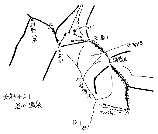 | 上越 / ホワイトバレーへ 1981年2月1日 メンバー:L菅沼、針谷、高野、今野 2月1日(日) 曇り後雪 前日は天神平で悪雪の練習をし、田尻沢の頭近くに雪洞を掘り一夜を過ごした。雪が柔らかく短時間のうちに広い雪洞が掘れた。 朝谷川岳へ向かうパーティを見送り、ゆっくりと出発する。田尻沢の頭へはツボ足で登り、天神平のゲレンデへ滑り込んだ。時間が早いのでリフトを使い自由に滑る。 9:45に高倉山リフトの終点でシールを付け出発する。高倉山への尾根は広いのだが右手には大きな雪庇が張り出しており左側を行く。15分ほどで高倉山に着く。積雪が多く、大きそうな雪庇がある。 シールをはずし東の方向へ下り、雪庇が切れている所から南東に下る尾根に入る。雪崩に注意しながら一人ずつ下る。あとは少し痩せた尾根をギルランデや山まわりで適当に下る。鉄塔のあるコルで一休みし、シールを付ける。ここら辺りから完全に雪になってしまった。 湯蔵山へは広い尾根を登る。手前のピークを過ぎ2つ目のピークでシールをはずす。ここからはホワイトバレー方面からのワカンの跡がある。狭い稜線を慎重に下る。雪が多いので何とか滑れるという感じだ。湯桧曾へ下る尾根の分岐からは尾根も広くなり、滑りやすいと思ったのが、今日は雪が悪くただ苦しんで滑るだけだった。 リフトが見え少し登るとホワイトバレーのゲレンデ上部に出た。急なゲレンデを一滑りでゲレンデ下につく。大休止の後谷川温泉へ下り、今日一日の汗を流した。 【コースタイム】 高倉リフト上 9:45 → 高倉山 10:00 → 鉄塔 10:25/45 → 湯蔵山 11:20 →ゲレンデ上 12:25 → ゲレンデ下 12:50/13:40 → 谷川温泉 14:00 記:菅沼、電子化:作野 【概念図】 ![]() |
