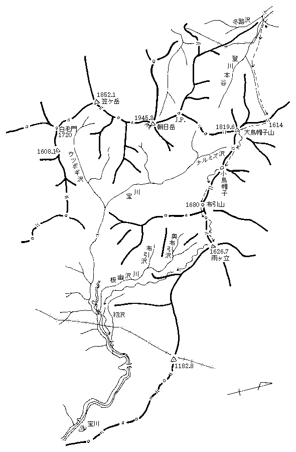 | 上越 / 登川より 1981年3月28日〜29日 メンバー:L.小森宮、伊藤(碩)、長谷川、今野 3月28日(土) 曇り後快晴 六日町で1時間半ほど仮眠してからタクシーで清水まではいる。バス停から200m程のところでシールを付けていると、民宿のオヤジさんが「今年は雪が多いし、降ったばかりで林道沿いは危ないよ。」等アドバイスしてくれる。早速登り川に降りて堰堤の脇を行く。20cm程の新雪の中、広い河原を快調に進む。伊藤碩志さんがメモ替わりに超小型のテープレコーダを使っているのは面白そうだ。 丸ノ沢出合いからは雪で真っ白な丸ノ沢の斜面が対岸正面に見える。なかなかスキーに良さそうだ。ここを過ぎると沢幅が狭まって急なので、右岸の台地状にキックステップで登る。次の桧倉沢出合いもやはり右岸の台地状に、今度はアイゼンを付けて登るが、硬くクラストして急なので、前爪だけで登る羽目になった。ここは黒塗り2階建ての頑丈そうな避難小屋がある。この先で送電線が右に分かれ、広々とした台地状から桧倉山<−>大烏帽子山のコルからの沢に入り稜線を目指す。この辺から陽射しが一段と強くなり、風も全くの無風で、沢の両側からも照り返しがものすごく、暑さで頭がクラクラしてくる。脱水状態気味で稜線に這い上がった時には3時になっていた。クラストした斜面にアイゼンを利かせて大烏帽子山に着き小烏帽子とのコルまで、今日始めてのスキー滑降となる。ここでツェルトを張ることにする。 【コースタイム】 六日町 6:00(タクシー) → 清水 6:25/30 → 丸ノ沢 8:50/9:10 → 桧倉沢小屋 11:10/30 → 1614mコル 15:00/35 → 大烏帽子山 16:35/45 → 1650mコル(ツェルト泊) 17:10 3月29日(日) 快晴 今回はシュラフカバーを2枚で試してみたがやはり寒い。ホカロン1つにかじりついてウトウトするうちに夜が明けた。今日も快晴である。ツェルトをたたみ、アイゼンがよくきく斜面を尾根通しに行く。この辺からは奥利根の山々、尾瀬、また近くに朝日岳東面の真っ白な大斜面等が見渡せ、全く素晴らしい。雨ケ立直下はザラメのフィルムクラストで最高であった。布引尾根を快調に飛ばす。林の中の急斜面の腐れ雪には参ったが、初沢の上から広い雪原に思い思いのシュプールをつけ、ほぼ夏道沿いに林業試験地観測所につく。 ここからの林道の緩傾斜にそろそろウンザリしてきたところで宝川温泉に着いた。時間も早いしせっかくなので露天風呂で汗を流し山スキー湯治会に変身する。 【コースタイム】 ツェルト 7:40 → 1680m 8:45/9:35 → 雨ケ立 9:55/1010 → 1160m 10:55/11:20 → 観測所 11:40/12:10 → 宝川温泉 13:30/15:00(温泉550円) 記:小森宮、電子化:作野 |