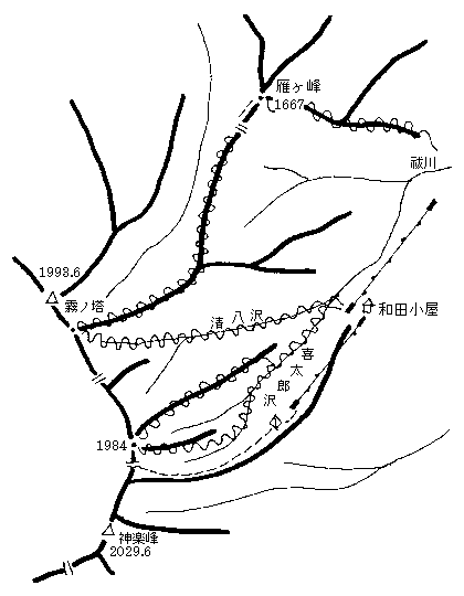 | 上越 / 雁ヶ峰へ 1982年2月21日 L猿田、小森宮、今野、伊藤(久)、他1名 1982年2月21日(日) 神楽峰 → 雁ヶ峰 バスを降りると雨模様の空、『最高の新雪』の言葉で来たのだがパウダースノーは無理かな?ロープウエー、リフトを乗り継いで、和田小屋の前で身仕たくをする。最終リフトを降りるとなんと青空。シールをつけてウキウキ気分で神楽峰に向う。雪がしまっていて1時間程で到着する。ティータイム後、おうとつの斜面を滑る。 1921m点と次の2010mはシール登行。小さな雪庇が出来ていた。急な登りから解放され、ひと息ついているとガスが上がって来た。あっと云う間に視界不良、小森宮さんが地図とコンパスを頼りに先行、スローな滑りになる。少し登りに入りガスの中で雁ヶ峰(1667m地点)を確認する。 方向を見うしなわないように滑り出すが、雨もふりはじめ、ズッシリと重い深雪で滑りにくい。安全第一を取って斜滑降で滑るが急斜面になると、なだれる恐れも加わって緊張の連続で女性陣はおじけづいてしまった。凹地はなるべくさけ、樹林の中に入る。やっとリフトが見えた時にはホットする。雨がザーザー降るゲレンデを飛ばしロープウエーに乗る。 【コースタイム】 最終リフト 9:30 → 神楽峰10:30/50 → 2010m 12:30/13:00 → 雁ヶ峰 14:00 → リフト上 16:20 (今野 記) 【概念図】 ![]() |