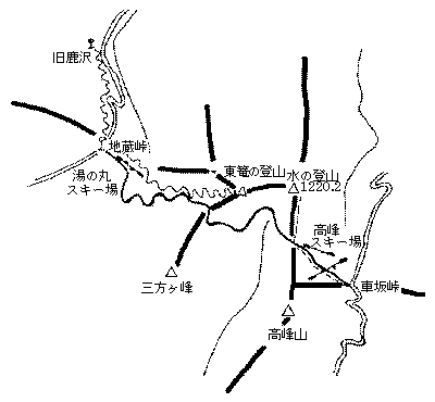 | 上信 / 七千尺コース 1981年1月11日 菅沼単独 1981年1月11日(日) 雪 前夜上野を20:53の越前で出発した。これだと小諸に0時前に着くのでたっぷり仮眠できる。 朝起きると一面の雪だ。6時の一番バスに完全装備で乗り込む。約1時間で車坂峠に着いた。バス終点前の食堂で出発の準備を整える。雪は降り続いており寒い。視界は少しあるので出発する。 食堂の前からゲレンデを横切るように水の登山への稜線に向う。稜線は広く適当に斜登高で登る。頂上直下は急なため水の登山の北側を巻きながら登る。雪が多く木の上部だけが雪の上に出ており、やたらもぐって歩きづらい。 篭の登山へ続く稜線に出て少し左手へ登ると水の登山なのだが、もぐってしまい登れずあきらめて篭の登山へ進む。ここの稜線は左側は切れ落ちていて右側は樹林帯になっている。まだ雪庇は出ていない。小さな登り下りがあるがほぼ平らな稜線だ。 篭の登山手前に冬は大きく右へ巻くように標識があるのでそれに従って巻道を登る。尾根を越えると急な広い雪の斜面に出る。そこを適当に登ると篭の登山の山頂に出た。 山頂には木がなく風をまともに受け寒い。雪が降り続いており展望もない。長居は無用。スキーをつけ滑り出す。雲の切れ目から湯の丸方面が時々見える。山頂直下から沢の中へ滑り込んだのだがすぐに樹林帯にぶつかってしまい、ヤブの中のスキーになってしまい疲れてしまった。 林道に出るとヤブがないかわり傾斜がなくなってしまい滑らない。ゲレンデへ出るとひと滑りで地蔵峠に着く。ここからはバスで小諸へ下れるのだが時間が早いので鹿沢温泉へ下ることにする。温泉では風呂に入れてもらえずすぐに帰京する。 【コースタイム】 車坂峠 7:30 → 水の登山直下 9:00 → 篭の登山 10:35/:50 → 地蔵峠 11:35 → 鹿沢温泉 12:05 記:菅沼、電子化:西川 【概念図】 ![]() |