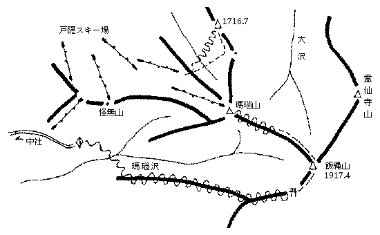 | 北信 / 1980年12月29日〜1981年1月2日 メンバー:CL菅沼、長谷川、今野、小森宮 後発・・・郡司、重田 白馬岳を目指した正月合宿は、56豪雪で大糸線不通の為、松本で足止め されて後発2名と合流後、戸隠スキー場周辺でツアーをする事に変更した。 12月29日 松本より先不通とは聞いていたが、行けばなんとかなるだろうとガラガラの電車に乗り朝暗い内に松本に着く。しかし白馬岳への入山はおろか、大糸線のスキー場へすら行けない状態なので、後発組を待つ間、松本市内をぶらついて一応ツアーが出来そうな所という事で書店で地図を捜す。結局電車が動いているという条件等から、戸隠スキー場周辺という事で意見がまとまる。 12月30日 後発組の2名と松本駅の改札口で待ち合わせてすぐに長野行の電車に乗る。長野駅で不要なアイゼン、ワカン、スコップ、ピッケル等を預けバスで戸隠スキー場へ向かう。バードラインは38豪雪以来の雪で、やっと開通したばかりだとの事。中社でバスを降りスキー場脇の林道を10分程入った所をテント場とする。もう昼近くだが、リフトで行ける所まで行こうという事で瑪瑙山へ向かう。飯縄山への鞍部まで重い雪を滑り込み途中の小ピークまで登ったが時間も遅いので引き返す。 【コースタイム】 松本 5:08 == 長野 6:17/7:25 = バス¥980 = 中社 8:50/10:00 →・→ 瑪瑙山 13:05/:20 →・→ 1720mピーク 14:25/:30 → 瑪瑙山 15:20 → テント場 12月31日 今日は飯縄山へのツアーである。正月のせいか、リフトの動き出すのが遅く瑪瑙山へリフトで着いたのが10時近くになってしまった。クラストした雪を鞍部まで滑りシールをつける。ここから飯縄山へはちょっと狭い尾根で急なジグを繰返す。1時間半程で飯縄山頂である。昼飯をほおばりながら見渡すと、ここから霊仙寺山へトレールがついている。この山頂から飯縄スキー場へ滑り込むのも面白そうだ。 今日は飯縄神社から西へ延びる尾根上のコースをとる。雪質は気温が低いせいか仲々よい。特に樹林帯に入ってからは気持良い粉雪の滑降が楽しめた。緩やかな尾根を滑り、途中1300m辺で右に派生した尾根からメノウ沢へ滑り込む。沢を横切り若干のアップダウンでテント場に帰り着く。山頂から2時間程であった。時間も有るのでゲレンデで滑ってみるが、すぐ飽きてしまい早々に切り上げる。 【コースタイム】 テント 7:40 → リフト下 8:00/40 → 瑪瑙山 9:55/10:00 → 鞍部 10:10/:25 → 飯縄山頂 11:40/12:10 → テント 14:20 1月1日 今日も快晴。お雑煮、黒豆、コブ巻、なます等正月らしい朝食の後、昨日瑪瑙山から目についたまるっこい山「高デッキ山」へ向かう。我々以外にはツアーの人影も無く、おわんを伏せたようななだらかな山へ、のんびりとシールを滑らせる。高デッキ山からは、妙高や火打、戸隠そして行く筈だった白馬等見渡せる。頂上からは下の広っぱまで気持ち良い新雪の中を、あっという間の滑りであった。まだ昼前なのでゲレンデ脇の新雪など荒らして遊ぶ。正月で混雑したゲレンデを、しぶとく滑る者、飽きてテントに帰りしるこを作る者など思い思いに過ごす。 【コースタイム】 テント 8:10 → リフト 8:40 → 瑪瑙山リフト下 9:25/:40 → 高デッキ山 10:20/11:00 → 広っぱ 11:10/:20 → ゲレンデ 11:30/:45 → テント 15:00〜:40 1月2日 朝食後、早々にテントを撤収しタクシーに乗り込む。スキー場にのぼって来る車の行列に見とれ?ながら長野駅へ向かう。 【コースタイム】 テント 5:00/7:35 → 中社 7:50/8:15 = タクシー¥5000 = 長野 9:55/10:37 = 信州6号 記:小森宮、電子化:西川 【概念図】 ![]() |
