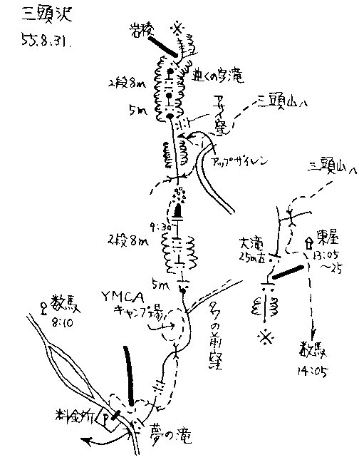 | 奥多摩 / 南秋川 1980年8月31日 メンバー:L菅沼、佐々、今野 8月31日(日) くもり 前夜五日市駅前にて仮眠し、朝一番の数馬行バスに乗る。旧道を利用し有料道路の料金所まで登る。左手のキャンプ場への道に入り、キャンプ場の端から沢におりる。 最初の5mは左手より登る。続く2段8mは下段は右より登り上段は左手のややかぶり気味の壁を越える。 堰堤は右岸より高巻く。伏流となりヤブがうるさくなる。頭上を山道が横切っているのでそれを利用して高巻く。登山道に入り沢を離れる所から沢へおりる。ここでアップザイレンをするはめになった。沢を忠実に登った方が良い。アサイ窪を右に見送り核心部となる。2段8mは倒木を利用し左手より登る。この辺り高巻きは悪そうだ。 ナメ状の小ゴルジュをすぎると大滝だ。傾斜はあまりなく一見容易そうだが上部はホールドも少なく苦労する。すべりやすく、途中シャワーを浴びるのでアンザイレンをして登る。 大滝の上には三頭山への立派な登山道があり右手には東屋風の小屋がある。遡行は大滝で中止し、登山道を利用して数馬へ下山する。 (菅沼 記) 【遡行図】 ![]() |