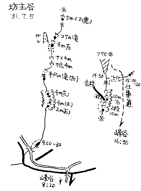 | 奥多摩 / 峰谷川 1981年7月5日 メンバー:L菅沼、伊藤(碩)、長谷川、高野、今野、 斎藤、猿田、川口(敏)、蔵田、角田 7月5日(日) 曇り 前夜奥多摩駅に集合し、氷川神社の舞台で仮眠する。翌朝峰谷行のバスに乗り終点で下車する。 峰谷川沿いの道を登る。途中から茂窪谷への林道へ入り、道が大きく右へ曲がるとすぐに出合だ。出合の橋のすぐ上に堰堤があり小さなダムになっている。 ワラジにはきかえ遡行を開始する。初めのうちは平凡な小沢という感じだ。沢が右に急に曲がる所から滝場が始まる。2m4m4mと滝が続き小ゴルジュとなっている。初めの滝は右から登り、次の4mは左のバンドを斜上する。次の4mはやや悪く、ツルツルの右岸を慎重に登る。半円の滝はツルツルの滝で今回は水量が多く通過には手間がかかった。巾広4mを過ぎ左に崩壊を見送ると8m滝だ。アンザイレンをして左から登る。 C.Sのある5m滝は水量が多いと悪く、全身ズブ濡れになってしまう。行く手には巾広の2段10mが見える。まとめて左のガレから高巻く。落口に立つと岩稜の陰にチムニー状の10mが豪快に水を落としている。左岸が階段状になっており、見た目よりやさしい。 滝場も終りですぐに二俣となる。上方には大きなワサビ田がある。右俣へ入り、小滝を越すと仕事道が横切っている。鷹の巣山へはそのまま沢をつめるのだが、今回は仕事道を利用し奥部落を経て出発点の峰谷へ戻る。バスの本数が少ないためタクシーを呼び奥多摩駅に戻った。 (菅沼 記) 【遡行図】 ![]() |