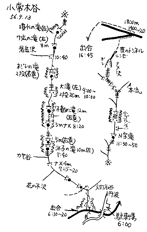 | 奥秩父 / 丹波川 1981年9月13日 メンバー:L.菅沼、伊藤(碩)、作野、長谷川、重田、高野、古川 9月13日(日) 曇り 前夜タクシーで余慶橋へ入り仮眠する。早朝に出発し、丸木橋を利用して丹波川を渡り滑瀞谷出合いに立つ。仕度を整え溯行開始だ。右手に火打石谷を見送り小常木谷へ入る。釜のある滝を越えて暫く行くと左手からカヤ谷が合流する。いよいよ置草履の悪場だ。 すぐに大きな釜を持つ兆子の滝だ。左壁を登る。続くツルツルの5m滝は右手より高巻く。大きな釜のある滑滝をすぎると不動の滝だ。これは登れず左岸の枝沢の滝を途中まで登り高巻く。沢が右に曲がると続いて大滝が現れる。これはアンザイレンをして左壁を登る。残置ハーケンがたくさんありA0で登る。次のネジレの滝は上段がツルツルなので右手より高巻く。 ここまで来ると悪場も終わり、ゴーロと滑滝の連続となる。沢も明るく開ける。左から岩岳沢が合流すると幅広8m滝だ。一見むづかしそうだが右手から簡単に登る。続く噴水の滝も右手より登る。再び滑滝とゴーロの繰り返しとなりN字滝が現れる。これはどこでも登れる。 小さなゴルジュを過ぎ沢床が赤い岩となると滑沢出合いだ。滑床の中に出合っている。滑沢に入ると滝が連続し、まるで上越のスラブを思わせる。すぐに二俣となり右俣へ入る。上部の滝はボロボロで神経を使う。奥多摩では非常に珍しい。ガレを登るとルンゼとなり笹のトンネルの中に水流は消える。踏み跡を頼りに稜線へ出る。 岩岳尾根の立派な道を出合いまで下り、滑瀞谷を下り余慶橋へ戻る。 記:菅沼、電子化:作野 【遡行図】 ![]() |