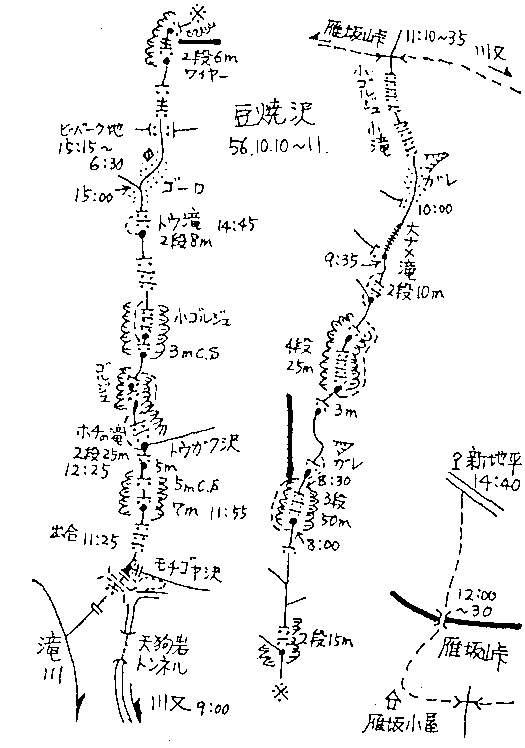 | 奥秩父 / 滝川 1981年10月10日〜11日 メンバー:L.伊藤(碩)、小森宮、坂井、菅沼、長谷川、高野、今野、蔵田 10月10日(土) 晴れ 前夜西部秩父へ行きタクシーで川又へ入り仮眠する予定だったが、遅すぎるという理由でタクシーに乗せてもらえず、仕方なくお花畑駅で仮眠となった。翌日一番電車に乗り、三峰口からバスで秩父湖、更に乗り継ぎ、川又に着いた時は9時になってしまった。 滝川沿いの国道140号を通り、天狗岩トンネルを過ぎると本流と離れ、豆焼沢沿いの道になる。左下にゴゼの滝が見えるが道路工事の為ほとんど埋まってしまっている。丁度滝の上で橋を架ける工事が行われている。現場を足早に過ぎ、モチゴヤ沢を下降し豆焼沢へ下りる。 小滝を越えて行くと7m滝だ。左側から登る。続く5mC.S.は倒木を利用し登る。ここで沢は開け前方にホチの滝が見える。トウガク沢手前の5m滝は右を巻く。ホチの滝は落差があり水量も豊富で実に立派だ。見物後左の踏み跡を利用し高巻く。 続くゴルジュは始めの淵を右からへつり、次の滝の左を登り抜けられそうだ。3人だけ挑戦し、残りは右手の踏み跡を利用し小さく高巻く。結局3人はゴルジュ出口の滝がツルツルの為登れず、上からザイルを垂らし何とか登った。 次のゴルジュは始めの3mC.S.を登り、あとは左より高巻く。小滝が続きどんどん登る。やがて2段8mトオ滝が現れる。左手に倒木があり利用して登ろうとするが離れ過ぎの為駄目だった。下段はツルツルで登れず左から高巻き、上段は左から登る。ここに限らず大変滑りやすく、スリップに神経を使う。ここから沢は開けゴーロが続く。左から沢が入り、再び沢が狭くなる手前によいビバークサイトがありそこで今日の行動を中止する。久し振りに大きな焚き火を囲んで沢の中での一夜を過ごした。 10月11日(日) 晴れ 朝のうちは水が冷たい。出発するとすぐに十字点だ。小滝を越えるとワイヤーのある2段6m滝だ。右側から登る。滝が連続し、2段15m滝に行く手を阻まれてしまった。左から登るのが簡単そうなので登るのだが、途中1m位のところが切れており悪かった。右側からも2人登り、2人は左のルンゼから高巻いた。 3段50m滝は傾斜が強く落差もあり立派な滝だ。滝の途中に大木が立っておりちょっと変な感じだ。見物後左の踏み跡を利用して大高巻きをする。右手に小さなガレを見送り、沢が右へ曲がった所にある3m滝は簡単に越える。1人だけシャワークライムをして左から登る。 すぐに4段25m滝だ。この滝は傾斜が緩く、水を浴びれば登れそうだ。濡れついでのコモさんだけ挑戦する。ずぶ濡れになりながら必死に登ったようだ。残りは右の踏み跡を利用し高巻く。続くゴルジュも一緒に高巻く。ここを過ぎるとゴーロ状となり左から沢が入り2段10m滝と続く。下段は左から巻き、上段は左を登る。 暫くゴーロが続き、左から滝となって沢が合流する。本流にはスダレ状の大ナメ滝がかかっている。適当に登り、右手にガレを見送ると小ゴルジュとなる。小滝が続きどんどん高度を稼ぐ。小滝をどんどん登ると、ひょっこりと突然登山道に出る。 正面には和名倉山が大きく見える。歩き易い登山道を雁坂峠へ登る。峠を吹き抜ける風は冷たい。山は一面の紅葉が美しい。 小休後、新地平への道を下る。途中地図の道と全く違う所を通り新地平へ下った。車道に出るとちょうどタクシーが登ってきて、それに乗り塩山へ下った。 記:菅沼、電子化:作野 【遡行図】 ![]() |