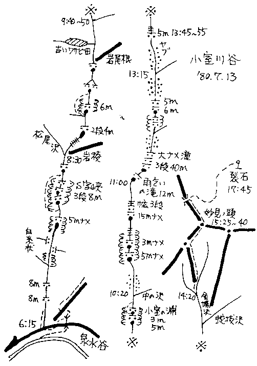| 大菩薩 / 丹波川 1980年7月13日 メンバー:L.菅沼、梅原、長谷川、今野、藤谷 7月13日(日) 晴れ 前夜早めに奥多摩駅に集まりタクシーで三条新橋まで入る。泉水谷へ少し入った所に大きな駐車場があり、そこにツェルトを張る。梅雨時と言うのに満天の星が輝いている。 朝5時に出発する。久しぶりの太陽が暉しい。泉水谷林道を進むと左側に大きな切れ込みが見える。小室川谷だ。谷へ下りる道があり、泉水谷には吊橋がかかっている。道は北尾根方面に登っている。この橋から沢に下り、少し下ると小室川谷の出合いだ。 ゴーロの中を進み8m滝2つを右から越え、左手に白糸上の滝を見送るとゴルジュとなる。5mナメは釜が深そうだが腰まで水に入り右より登る。すぐにS字峡だ。左から小さく巻く。松尾沢を左に見送りナメ滝を越えて行くと、沢は暗くなり6mのツルツルの滝が現れる。左手に残置ハーケンが連打されている。ここは左から簡単に巻く。左に古いワサビ田を見送り暫くすると小室の淵だ。大きな釜に腰まで入り左手のバンドより登る。次の滝は登れず左より巻く。 ナメ気味の小滝を越えて行くと次ぎは右に曲がり、正面に雨乞いの滝が現れる。アンザイレンをして右から登る。続いて40mの大ナメ滝だ。傾斜があるのでここもアンザイレンして登る。滑ったら一気に下まで落ちそうな滝だ。2段の幅広の滝を右から登るとゴーロ状となり古いワイヤー等が目立つようになる。ヤブに覆われたゴーロを登り、右に蛇抜沢を分け金場沢に入る。 水が涸れた所で左手の尾根に取り付き、ヤブもなく小一時間で妙見ノ頭に登ることが出来た。少し時間がかかりすぎたようだ。大菩薩峠から足早に列石への道を下る。 記:菅沼、電子化:作野 【遡行図】 ![]() |