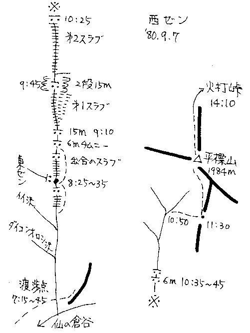 | 上越 / 仙の倉谷 1980年9月7日 メンバー:L.菅沼、長谷川、松森、小森宮、佐々、重田、伊藤(碩) 9月7日(日) 雨後曇り 5時出発を目途に目を覚ましたら少し雨が降っている。群大ヒュッテに付く頃にはほとんど止んだ。食事をして平標沢の出合いまで行き沢に入る。河原を歩いて西ゼンの下に着く。薄いガスで良く見えないが、不気味なナメだ。 流れの右に取りつくワラジのフリクションはよくきいているがなぜか滑りそうな気がする。真っ直ぐ立って一歩づつ登ればどんどん高度が稼げる。夢中で120mもある第一スラブの上に出ればあとはそれほど怖い所はなく快適に溯行でき、第二スラブは200mもあり急だけど階段状なので安心できるが右によりすぎると上に行ってトラバースを強いられる。やがて水が冷たくなったと思っていると溯行は終りでちょっとあっけない。気疲れでクタクタの所だがクマ笹を分けて一旦稜線に出てから平標山に登る。10人位の登山者に混じって、橋爪、藤谷両O.B.がいた。前夜は土樽の駅で先に寝ていたけれど今朝は起きたらもういなかった。彼らは始めの所を左から登ったそうだ。山頂はじきに寒くなってしまったので平標山の家を経て火打峠に下ったが、この道は石がゴツゴツで足が痛かった。 【コースタイム】 土樽駅 5:00 → 群大ヒュッテ 6:10 → 渡渉地点 7:10 → 西ゼン出合 8:30 → 6mチムニー滝 9:00 → 第一スラブ下 9:10 突破30分 → 第二スラブ 10:00 通過25分 → 二俣 10:50 → 平標山 12:00 → 火打峠バス停 14:05 記:伊藤碩志、電子化 作野 【遡行図】 ![]() |
