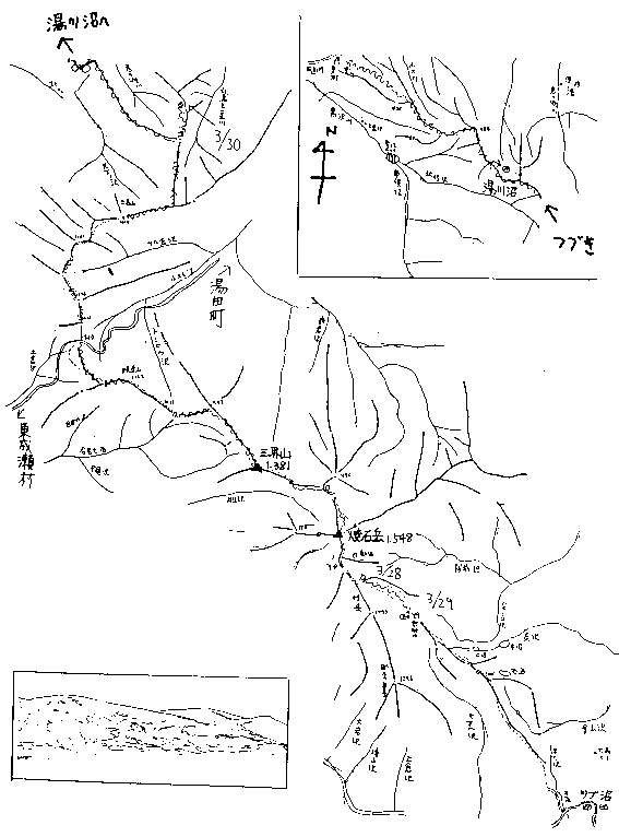 | 東北北部 石淵ダムより三界山、巣郷温泉へ 1989年3月28日〜31日 L:田中健、手塚紀恵子、佐藤晶彦 3月28日(火) 曇り 当初は、5月連休に計画したのだが、3月末に変更した。少雪の今年には、幸運だった。 尿前には雪はなく、ツブ沼を越えて、平七橋まで歩く。平七橋の西100mほどの所にわかりにくい林道がある。(帰ってから調べると、平七林道との名がある。)駅では小雨だったが、曇りとなる。プレートは、その小尾根の上に1番があると、手塚さんは以前の経験を話してくれた。 林道を離れて、小尾根に取り付くと5番のプレートがある。以後は、プレート、赤布が細かく打ってあり、銀明水までは迷うことはない。地図の1001mあたりで夏道と合わさる。小屋はNo.100である。 小屋で一休みする。春合宿の高校生がいた。ムッとする暖かさだ。小屋はきれいで、設備がよい。お湯をもらって、お茶を飲む。出掛けに、雪を掘った下に出ている名水、銀明水を味わう。高校生達が掘ったという。 再びシールで登り始める。小屋から上は木が無くなり、ガスが出てきてルートがわかりにくくなる。なだらかな尾根をトラバースして、行き過ぎないようにその尾根を直登した。北に向かって、やや下りになった所でガスが濃くなり、わかりにくいのでそこまでとした。 西側に、山の裾野が見え隠れする。それを本峰の裾野だと決める。後に混乱を引き起こす。 夜半中、強風だった。弱まる気配は全く無かった。 3月29日(水) 強風、ガス 強風とガスである。行動は無理そうなので、小屋まで下った。停滞とした。ストーブのある小屋での停滞は安心だ。午前は干し物、午後はまき割り、掃除をした。 夕方、水沢あたりの街の灯が見えた。好天を期待してシュラーフにもぐった。 3月30日(木) 快晴 好天である。はやる心を制しながら出発する。横岳、本峰はガスの中だ。小屋のすぐ前の尾根を登り沼に出た。泉水沼かと考え暫くトラバースをして前日のテント場を確かめた。前日の西斜面を登ってピークに出るが、手塚さんは、焼石の頂上ではない、と言う。ガスの中をピークを北に2つ越えると、瞬間、ガスが切れ、横岳の一番北にいることがわかる。本峰は少し下って登り返す。ひと登りである。下りにしても斜度が適している。 頂上にいると、陽が射し、ガスが切れる。南の栗駒、西の鳥海、北の牛形、東の経塚山が見える。三界山への尾根筋も確認でき一安心である。 シールを取り北面を下る。佐藤さんがトップで行く。1492mのピークの手前で沢を下り、三界山へのルートに入る。一滑りだが楽しめた。1304m地点の手前で休止。3本のシュプールが逆光の中で光っている。 三界山への登りは両側が切れ急である。頂上から東成瀬村の家々が見える。蟻巣山、三森山への様子がわかる。1149mまで200m滑るが平らで快適とは言い難い。しかし、雪が硬いので助かった。 コルから蟻巣山へ150m登る。蟻巣山の頂上からルートを確かめる。湯田町から成瀬村への林道もよく分かる。エスケープルートに考えていた所だ。 この頃から天気がよすぎて雪がザクザクになって歩きにくい。100m登って100m滑るというようになる。それを三森山まで三回繰り返した。下りは2〜3分とはいえ、ぶなの大木の間を縫って滑るのは東北の山らしく大満足だ。1082mのピークに出ると、南東方向に焼石連峰が白く光っている。 三森山では4時になる。ルートを確かめる。佐藤さんが地形をよく見ている。県境に沿って下る。三森山のすぐ東の狭い尾根を外さないほうがよい。930mの少ピークを巻いて北に進む。鬼瀬川の源頭部から湯川温泉に出ようと713mから県境を離れ北に進む。 西の空が赤い。尾根と沢が入り組んでいて、平らな尾根を下ると沢に当たり、登り返しまた下ると沢に当たる。あきらめて600m付近にツエルトを張った。 3月31日(金) 曇り 県境尾根を下ることにして、770mまで登り返す。高曇りで雪が硬い。県境を下る。注意する所は西に進路を変える2ヶ所だ。622m地点、582m地点だ。途中で湯川沼などを見る。この尾根は雪が硬かったので滑れたが、午後のザクザク雪ならば歩くことになろう。 582mを越え西に進むと村が見え出し行きが切れてきた。 あくまで、県境を辿り420m地点で強引に薮の沢に入り林を抜けると田んぼに出た。200m先には巣郷温泉があった。山行の汗を流した。 停滞を含めルートファインディング、ロングコース、ぶな林共に堪能できた。焼石連峰は山が丸く上部に木が無くスキーに適している。駒ケ岳を越えるルートも楽しそうである。滑降の同志会向きには蟻巣山から林道を下るルートがいいかもしれない。いずれも天候次第だ。 計画を立てるに当たって水沢山岳会小野寺氏のガイドを参考にした。 (「岳人」No.453) 【コースタイム】 3/28 尿前 7:25/40 −> 取り付き、平七沢 9:00/20 −> 銀明水 12:10/50 −> 1460m ツエルト 13:40 3/29 テント場 8:10 −> 銀明水小屋 8:30 停滞 3/30 小屋 6:05 −> 横岳ピーク 7:10/25 −> 焼石岳頂上 8:15/45 −> 三界山 10:25/45 −> 蟻巣山 11:50/12:15 −> 