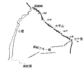 | 会津 高杖スキー場より保城峠へ 1989年2月19日 L西川克之、菅沼博、陶山泰、岡阪準一、小森宮秀昭、手塚紀恵子、蔵田道子、 長谷川淳一、鈴木鉄也、馬場修爾、篭島寿一、佐藤、梅原秀一 2月19日(日) 前夜宿泊した、八総の山本屋旅館から、高杖スキー場迄は、マイクロバスを利用する。リフトを四本乗り継げば、すぐ隣の七ケ岳より3m高いピーク(標高1638m)に到着してしまうのだが、スキー場の混雑で、リフトに1時間費やした。 前日はここから、七ケ岳に登って北へと下ったが、本日は北西に延びる尾根を保城峠へと向かう。前日の密林と悪雪での苦闘のせいもあるが、今日の最初の滑降は、非常に快適に感じられた。昨夜の降雪は朝の冷え込みで乾燥し、ブッシュは少し気になるが、木立ちは滑降コースが見つからない程は密ではない。鞍部まで標高差130m程、そこでシールを装着して1602mのピークまで約百m登る。保城峠迄、5回の滑降、4回のシール登高。いずれも標高差百m前後であるため、シール着脱を頻繁に行ったので、大人数のせいもあり、少々時間をロスした。 大平山は上部を右側にトラバースする。(この尾根は多少右側に寄った方が、樹林が疎であるので、滑降時もそちら側を使った方が良い。)今日は快晴であり、昼近くになるにつれ、暖かくなってきた。ただ、あまり展望のきく所がないのが、残念である。 1518mのピークから保城峠への尾根は、少しやせている上、樹林も密になり、少々苦労した。峠にはブリキの看板がかけてある。錆ついて判読出来ないが、多分峠を示しているのだろう。こんなうら寂れた峠は、冬でなくては訪れることが出来ない程、無雪期には道が荒れているのではないか。 峠から南西へと沢を目ざして下る。傾斜が急なうえ木立ちは密で苦労するけれど、所詮は距離が短い。暖冬のせいか百mも下ると水流に出合う。右岸に渡り、木立ちの中を滑っていく。林道に出るため、再び左岸に移ろうとするが、なかなか沢の雪に埋もれた箇所が見つからなかった。 林道に出れば、あとは直滑降でグングン下っていけばよい。それから農道を戻り気味に歩けば、高杖原の民宿街に到着する。再びマイクロを呼んだ。 今回は渋い東北の山スキーを楽しむことが出来て非常に満足だった。 (梅原秀一) 【コースタイム】 高杖スキー場 8:00 −> ピーク1638m 9:15 −> ピーク1602m 9:50 −> 大平山 10:10 −> ピーク1528m 11:10 −> ピーク1518m 11:40 −> 保城峠 12:05 −> 林道/農道分岐 13:20 −> 高杖原 14:20 【概念図】 ![]() |