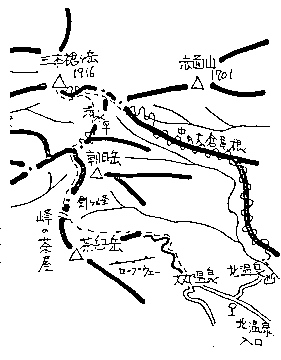 | 那須 大丸温泉より北温泉へ 1986年3月8日 メンバー:菅沼博 3月8日 快晴 前夜最終の宇都宮行で出発。仮眠後一番電車で黒磯へ行き、バスで那須湯元まで登る。 大丸温泉へのバスは1時間程ないのでタクシーを利用する。大丸温泉の駐車場では4パーティーほどが出発の準備をしている。天気はいいのだが風が少し強いようだ。シールを付けて広い尾根を登る。茶臼岳側の斜面が気持ち良く滑れそうに見える。峰の茶屋へはシールで登れるのだが、途中で雪が無くなってしまい、買ったばかりのアイゼンを使う。石のゴロゴロ道を歩くのでクツが痛い。 峰の茶屋で休んでいると風も大分おさまってきた。アイゼンのまま剣ケ峰に登り、朝日岳へ向かう。熊見曽根を分け清水平への下りでスキーを付ける。ほんの少しだがなかなかの雪質だ。三本槍ケ岳へは緩斜面をシールで登る。頂上の標識にはエビのシッポがビッシリと着いている。 山頂からの展望は雄大で、飯豊連峰の白さに目をひかれる。甲子方面に山スキー向きの斜面はないようだ。大峠方面は狭い稜線が続くが、その先の流石山、大倉山方面には広い斜面が見える。いずれも1400m付近から下の樹林帯をいかにこなすかが問題だろう。 山頂でスキーを付け滑降開始だ。山頂直下の50m程を除くと平坦なのであまり滑れない。中の大倉尾根への滑降開始地点まで少し歩く。そこで単独のスキーヤーに出合った。三本槍はカットしたようだ。以前未面山へ滑ったので、今回は北温泉へ滑る。上部はシュカブラが発達しており、若干滑りづらい。適当に斜面を楽しんで中の大倉尾根へ滑り込む。傾斜がゆるく、シュカブラなので少し手こずってしまう。1462mから南へ方向が変わる。アップダウンを繰返し、ヤブの中を滑るようになると、やがて植林の中へ滑り込む。1250m付近からはヤブの中に突入し、急なのとヤブのせいで、途中からはスキーを持って歩かされた。すぐ下が北温泉で、そこからバス停へが長く感じられた。 (菅沼) 【コースタイム】 大丸温泉 8:00 −> 峰の茶屋 10:00/20 −> 三本槍ケ岳 12:20/40 −> 北温泉 14:20 −> バス停 14:50 【概念図】 ![]() |