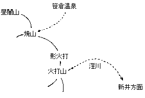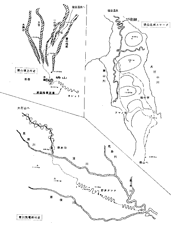 | 頚城 笹倉温泉より澄川滑降 「1泊2日のツアーも可能だが、滑走条件を選び充実した、ダイナミックな滑りを するためには、余裕の日程を組んで行きたいツアーコースのお奨め!!」 1988年5月3日〜5日 L:鈴木鉄也、田中健、陶山泰、井村修康 5月3日 晴れのち曇り、夜一時雨 親切なタクシーで、嫌がりもせず、急坂の悪路を行けるところまで上がってくれた。おかげで、つづら折りの急坂路を2/3ぐらいカットできた。身度しながら朝めしを済ませる。 つづら折りの最後の部分は、板の横ズレに気をつかいながら登るが、間もなく傾斜はゆるくなる。そこからは殆どを焼山川よりの右岸ルートをとる。日帰りの2人組パーティーが追い抜いて行く。広いスロープの末端の台地に上がる手前で左旋回し、僅かな急登の後、一休み。池の平の上あたりで見晴らしもよい。 スロープが右に曲がりだす頃、単独のスキーヤーが賽の河原の左の急斜面を降りてきた。我々は1600m付近の枯れ沢寄り、立ち木のそばの緩い斜面を足で整地しビバーク地とする。 シール登行できる約2000m位の地点まで上がって一滑り。 広大な斜面で下まで滑って行きたいが、足の疲れも一日の限界と悟って設営地までで終了。風も出てきたが、そんなに寒いとは感じない。 5月4日 曇り一時雨、午後晴れ、夕方から強風雨 気になる天気も、待ってても仕方ないと予定どおり出発。1ピッチ過ぎてスキーの板を引きずりアイゼン登行。昨日の風で雪も堅くなっている。2260mピークのある割りと顕著な岩稜の左側の雪面を詰める。もう少し雪が少なくなると、大きく割れが出来そうな処だ。 お釜までは途中何度ももぐったりしながら、ようやく登りきる。雨も本降りとなる。お釜の底で一休み。その南側の登りは時々石ころは落ちてくるし、噴煙も上がって、崩れそうな岩を見ながら僅かの急登。縦走路に出たところで、ガレ場となり板をザックに付ける。風に煽られ疲労度は2倍以上に感じる。 焼山のピークと、その先40メートルという下降点を確認し、スキー滑降にはいる。 今山行の最大斜度と思われる、キレットまでの400mの落差をスリル存分に味わう。火打山に向かう登りは、疲れた足をひきずり上げ、回復した天気に元気づけられながら黙々と登る。途中2パーティーとすれ違う。裏火打の窪地は絶好の幕営地かと思われたが張り終わると間もなく風雨となる。フライシートのない私のテントは、あっという間に水浸しになり、田中氏のツェルトに逃げ込む。雨は途中で止んだが、濡れたままの強風の一夜は、殆ど眠れず仕舞いで過ごす。 5月5日 快晴 風は朝も続いていたがだいぶ弱まり、快晴。張り綱を引き抜くのにカチカチに凍った雪を掘り起こすのには苦労させられた。身も引き締まる思いで火打の頂上に立つ。この時間に立山でスキーヤーが一人、凍った斜面で滑落死しているのを後で知った。 澄川は沢どおしに、初めはカリカリの雪質かなと思ったが、そう恐怖感はなく雪面も考えていた程は急斜ではなかった。むしろ、デブリやらの雪崩の痕跡の方が恐怖感をつのる。全く先駆者に敬服といった思いだ。 真っ白な斜面は最初のゴルジュ記号あたりまでで泥混じりのロングコースは、まぁ!疲れる。取水口手前あたりから、流れが出てきたが滑って来られた。スキー板をはずし黒菱川も渡り返して、登山道をいたる処、雪が途切れるが板を引きずりながら大体忠実に尾根まで上がる。丁度、標高1000mのところ。 再び滑り出し、地図の二つの●の場所まで。何かと思ったら、貯水タンクで確かに真っ黒だった。 送水パイプの脇を手こずりながら、スキー板をはずしたりまた、山菜取りのオジサンに「熊に会わなかったかい」と、脅かされながらも、やっと発電所に着く。地元外の無謀な山菜取りが横行してるらしく林道の途中にゲートを設けたそうだ。いずれはタクシーも発電所まで入って来られなくなるかもしれない。 * * * * * * * * * * * * * * * * * * * * 焼山北面で丸一日、滑りを楽しんだ後、焼山を登らずキレット、影火打を省略するルートとして、北面スロープ下部から直接火打山へ上がってもよい。賽の河原を下のあたりで渡り、火打の北尾根に上がるコースである。 また、澄川を滑って黒菱川を渡ったら菅沼さん達のように、山径をたどらず、尾根をダイレクトに詰めて一気に発電所まで滑ってもよかった。頚城山群、妙高はいたる処、山スキーのエリアでバリエーションが楽しめるが、どこも登り返しが大変なので、中途半端な滑りで終わらせないようにしたい。 (鈴木記) 【コースタイム】 5/3 糸魚川 4:30=(タクシー)−>笹倉温泉・つづら折り林道 5:15/50 −> 800m 6:45 −> 1000m 7:45 −> アマノ平迂回池の平上 8:30/9:00 −> 1330m 9:50 −> カレ沢際1600m「設営」 11:30/12:45 -> 焼山北面・岩峰下 2000m 14:00 −> 設営地 14:30 5/4 起床 4:30・出発 6:30 −> 一の谷・大谷1850m 7:30 −> 2050m 8:40 −(雨) −> お釜底 9:45 −> 焼山 ピーク 10:35 −>(晴れる)−> キレット 11:35/45 −> 2100m 12:45 −> 2350m小ピーク 13:10/1