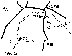 | 北ア南部 大喰岳より槍沢へ滑降 1984年4月29日〜5月4日 遠山友樹 単独 今回は天候のせいもあるが、気分的にくじけて槍平ベースに終始した。しかし大喰山頂からの滑りは楽しめたので、一応満足であった。 4月29日 晴れ 28日夜行の20:53発の急行「能登」へ乗るべく上野へ着いたら、元同志会メンバーの橋爪氏とバッタリ。新穂高温泉までは同じコースということなので、タクシーにも便乗することにする。橋爪氏はといえば筆者とは大違いで両手に花ときているではないか。こちらは寂しく単独行。 列車の乗り継ぎもスムーズにいき、7:30に新穂高を出発。天気は上々、一時間歩いた所(林道が沢から離れる所)から雪が始まる。例の遠山式手拭い仮面を取り出し、板を引きずることにする。本来の林道は沢を離れるのだが、沢ぞいの雪の上を進む。ところがしばらく行くと堰堤の所で沢そのものへ入らなければならなくなり、かなり急な斜面を林道のありそうな方向へシールで登り返すはめになった。 白出小屋の手前の橋までは林道(除雪済み)を歩かず、林道下斜面の雪の上を進んだ。その橋から上は除雪してないので、林道を行く。白出沢出合を少し過ぎて、しばらく行くと沢そのものに入ることができた。ところがすぐにデブリが現われた。 滝谷出合を通過して、南沢出合の少し下(標高1900m付近)まではデブリの山に泣かされた。一週間分の食料とテントが肩にこたえる。南沢の所で林が現われ、そこが槍平小屋であった。14:10着。着くとすぐ曇りだした。 4月30日 晴れのち曇りのちガス 前日の夕方天気がくずれる気配だったので、あまり期待せずに4:00起床。ところが晴れ。気がはやるのを押さえて、5:40に出発。アイゼンが良くきく。去年眺めた斜面を今度は滑れるのかと思うとピッチは上がる。テントは当然、槍平に立てたまま。約3時間でコル(飛騨沢)に着いた時は残念ながら既に曇ってしまっていた。 大喰岳ははたして滑れるだろうかと、少し躊躇した後、斜面を見るだけでも見ようと大喰山頂へ向かう。山頂へ着いて感激、雪の状態も斜度も申し分ない。去年の槍沢本流よりもすばらしい。あっという間に槍沢へ到着。約15分位。 残念ながら標高が下がるに従って雪がくさってくるのはしかたがない。いやな登りが始まる。歩いてガマン。2時間で槍の肩着。飛騨沢の1100mと槍沢の700mで富士山の1400mより少し多く登ったことになる。 飛騨沢のコルを12:30に出発。雪は滑るのに最適(但し2500m以上)で快調に飛ばして、約25分でテント着。 (遠山記) 【コースタイム】 4/28 上野発 20:53 4/29 新穂高温泉 7:30 槍平テント設営 14:10 4/30 テント発 5:40 −> 飛騨沢コル 8:50 −> 大喰岳 10:00 −> 槍沢出合 10:15 −> 槍ケ岳肩 12:15 −> 飛騨沢コル 12:30 −> 槍平 12:55 5/1 5/2 5/3 槍平 11:00 −> 新穂高温泉 14:00 【概念図】 ![]() |