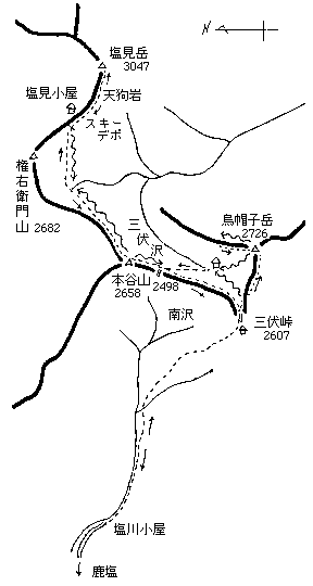 | 南アルプス 三伏峠より往復 1984年12月30日〜1985年1月1日 メンバ:L石垣隆宜、佐藤晶彦 正月は南アルプス・塩見岳(3047m)へ、スキー滑降の可能性は未知だが、冬の三千m峰には大いに魅力がある。南アルプスは、年末年始でも比較的天候が安定しているのも良い。 12月30日 快晴 前夜早めに伊那大島駅に入って仮眠、鹿塩行一番のバスは結構混んでいる。駒・仙丈程ではないが正月の塩見も人気が高いようだ。しかしスキーを持っているのは我々だけだ。鹿塩から樺沢までマイクロバスが出ているが、貧乏人は歩くに限る。今日は、スキーの付いた重いザックを三伏峠まで上げなければならない。沢から離れるところから登山道には雪が出てきたが、スキーで歩ける斜度ではない。スキーというハンディを背負っているにもかかわらず、割と速いペースで先行者を追い抜いていく。15時に三伏峠に到着、休憩後、少し烏帽子岳寄りに進んでから三伏小屋へ一滑りする。雪はクラストしており、ブッシュも出ていて快適とは言い難い。小屋のなかにツエルトを張る。 【コースタイム】 鹿塩 8:00 −> 樺沢 9:20 −> 塩川小屋 10:20/35 −> 三伏峠 15:00/25 −> 三伏小屋 15:50 12月31日 快晴 峠には戻らず、夏道沿いに本谷山の稜線を目指したが、歩かれていないようでラッセルとなる。しかも倒木が多く、スキーを持っていると煩わしい。稜線に出ると良く踏まれており、雪道が溝になっている。シールで登るが、時折の急登では溝のために斜登高が出来ず苦労する。引いていく方が良かったようだ。 本谷山へ登ると、谷を隔てて塩見岳が素晴らしい。すぐ近くに見えるが、道はぐるっと回っているので先は長い。ここでシールを外し、スキー滑降を試みる。石垣さんは、短く切って150cm程にしたショートスキーで、ボブスレーコースのような登山道を快適に飛ばしていくが、私は木に引っかけたり、樹木に突っ込んだりで歩いた方が早いくらいだ。 夏の水場からは登りとなり、塩見小屋直下までスキーを持ち上げてデポする。小屋から上はアイゼンの世界だ。心配していた天狗岩上部の急登はクラストしておらず、岩も露出しており、アイゼンとストックで充分である。 3047mの塩見岳山頂は期待通りの大展望、風もなく、冬山とは思えないような穏やかな天気だ。30分程ゆっくり展望を楽しみながら休んで下山、天狗岩を下るまでは慎重に歩く。スキーデポ地から樹林帯を滑降、石垣さんが快適に滑っていく。私はシールを付けたまま直滑降で滑る。本谷山へ登り返し、2498mの鞍部までは、夏のお花畑と思われる2ヶ所の斜面のみ滑降に適していたが、他は相変わらずのボブスレーコースだ。帰りは三伏峠経由にしたが、途中で小屋番に会い、小屋のなかにツエルトを張るなら小屋代を払えといわれるが、今日はツエルトを外に出し、テント代を支払うことで折り合いが付く。 スキーを持っているのは我々だけなので、三伏小屋のツエルトの持ち主だとすぐにバレてしまう。なお、この小屋番によれば、塩見周辺でスキーが楽しめる斜面はなく、腕に自信があれば、斜度40度以上の南沢(三伏峠から北に出る沢)が滑れるということだった。 峠からは昨日同様、クラストした沢状を滑り、約束通りツエルトを外に出す。2枚のツエルトをダブルで使うと意外に暖かいようだ。 【コースタイム】 三伏小屋 6:15 −> 本谷山 7:30 −> 権右衛門沢源頭 8:45/9:00 −> 塩見小屋下部デポ地 10:00/30 −> 塩見岳 11:30/12:00 −> 本谷山 14:35 −> 三伏峠 15:50/16:20 −> 三伏小屋 16:30 1月1日 快晴 今日は快適斜面を求めて烏帽子岳へ向かうが、昨日の小屋番の話によると望みがなさそうだ。 夏道を辿って烏帽子岳頂上に登り、北北東に派生する緩い尾根を滑る。昨日、塩見からも眺めた時は快適そうに見えた斜面も、いざ来てみるとクラストしており、這松が顔を出している。凹部に新雪があり、ほんの2〜3ターンだけ楽しめた。烏帽子へ登り返して、三伏沢源頭へ落ちる沢を滑る。次第に樹木が濃くなり、石垣さんは巧みに木をかわして滑っていくが、私はそう上手くは行かない。しかし樹林の中は雪質が良かった。 ツエルトをたたんで、最終のバスに間に合うよう急いで下る。石垣さんは塩川小屋から暫くスケートが出来そうな氷の林道をスキーで下ったが、私は恐ろしくて担いだまま下った。 普通に登っても2泊3日かかる塩見岳を、登頂だけでなく、スキーも楽しみ?ながら登ることが出来た。樹林帯など、制限された滑降についてはまだ修行が足りないようで、山スキーの奥の深さと難しいさを感じる山行であった。 【コースタイム】 三伏小屋 7:30 −> 烏帽子岳 8:35/9:00 −> (北北東尾根滑降) −> 烏帽子岳 9:50 −> 三伏小屋 10:10/11:05 −> 塩川小屋 14:15 −> 鹿塩 15:50 (佐藤晶彦 記) 【概念図】 ![]() |