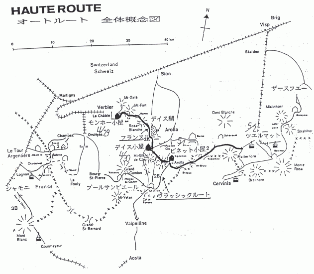 オートルート及びバァリスアルプス スキー登山 4月22日 土曜日 成田→ソウル→・→・→ 東京駅八重州にて、全員集含し、箱崎シティエアターミナルにて、出国手続きを行い、成田より大韓航空で出発した。今回は、北回りである。チューリヒまで、アンカレッジ、アムステルダム経由であつた。成田→ソウルが約2時間、ソウル→アンカレッジが約8時間、アンカレッジ→アムステルダムが約8時間アムステルダム→チューリヒが約2時間、合計20時間(フライト時間)の長旅であった。 4月23日 日曜日 快晴 チューリヒ→シャモニ チューリヒに現地時間午前9時に到着した。チューリヒよりシャモニまでは、代々木山幸ツアーのチャーターバスに同乗して、シャモニまで向かう。チューリヒ空港よりノンストップで3時間30分、快晴のシャモニへ無事到着した。 虚空にそびえたつ、シャモニ針峯群、モンブランがすばらしい景観で我々を迎えてくれた。全員のシャモニの印象は、『とにかく空の色が違う。』とのことであった。 タ食後、白野氏より依頼していた、ガイドのフィリップ ガルニ氏と面談。今後の日程及び装備について打ち合わせを行う。装備の中でシットハーネスとビップス(雪崩埋没探知機)がどうしても必要とのことで、全員困ってしまった。シットハーネスはともかく、ビップスの方は、考えてもいなかったのだ。結局、白野氏の意見で『日本でも積極的に使うべき』とのことで購入することとした。 日程の方は、当初の計画では、シャモニに到着翌日にすぐ、アルジェンチェール小屋に入る予定であったが、メンバー全員長旅の疲れからか、とても明日から山に入る元気がなく、高度順化を兼ねて、バレブランシュ氷河を滑ることにした。 4月24日 月曜日 バレブランシュ氷河滑降 午前8時ミディケーブル乗り場にて、ガイドのフィリップと待ち合わせる。ロープウェイを2本乗り継ぎ、富士山より高い、ミディ山頂まで一気に登る。快晴のミディ山頂からの大展望を楽しみ、バレブランシュ氷河の滑降地点まで、急な雪稜を固定ロープに伝わり下りる。ここからシャモニまで、標高差2000mの大滑降が始まるのである。ガイドのフィリップが先頭で滑りだした。シュプールのない斜面をどんどん滑って行ってしまった。ノーマルルートとは、あきらかに違う。 バレブランシュ氷河滑降コースのルートは2つあり、今回はバリエーションルートを滑るようだ。このコースは、滑るスキーヤーがいないので、新雪斜面であった。ガイドのフイリップは、クレバスだらけの氷河を右に左にたくみにルートファインディングを行い、ほとんど休まずに滑り下りていく。 時々クレバスがあることを注意されるが、我々には、それが全然分からない。1時間程滑っただろうか、40度近い非常に急な斜面にでた。ここを横滑りで慎重に滑り下り、(白野氏の話では、ここは雪が少ない時は、固定ザイルが張って在り、懸垂で下りる事があるそうだ。)ルカンの小屋の前にでた。小屋の中に入り、暖かい飲み物(田村氏はビール)を飲み、初めて休む。コースはここから一般ルートと合流するわけだが、ガイドはあい変わらず、シュプールのない斜面を選んで滑り下りて行く。 やがてメールドグラス氷河と合流する所にでて小休止。ここからは緩い斜面を、直滑降で滑り下りる。 斜度が緩く、スキーは楽しめないが、モアヌー針峯 ベルト針峯ドリュー グランドジョラスなどに囲まれた、このメールドグラス氷河は、実に気分がいいものだ。モンタンベール駅近くまで滑り、スキーを脱ぐ。ドリューを対岸に望む売店で冷たいビールで喉をうるおし、後はシャモニまで林道を1時間程で戻ってきた。夕方ガイドと明日からの行程を打ち合わせる。 ガイド『天候は下り坂だ。どうする』 我々 『ともかく明日は、始発のグラモンテのロープウェイに乗ろう。』 ガイド『了解天気が悪くてもアルジェンチェールの小屋までは入れるだろ。』 以上のような打ち合わせをして明日に期待した。 4月26日 水曜日 小雨 シャモニにて停滞 天気予報通り、今朝も悪天候で出発できない。西川、柴崎、田村の3氏は、レンタルサイクルでシャモニ観光、私と加藤氏は、スネルスポーツで買物などをして過ごす。ダハシュタインの山スキー靴が30000円、ラプラドのワンタッチアイゼンが6000円と安い。タ食後、ガイドと打ち合わせした。明日も天候が悪いようなら、タクシーでブールサンピエールヘ移動することに決めた。 4月27日 木曜日 午前雪、午後晴れ シャモニよりブールサンピエールヘ移動 朝、目覚めると、シャモニは真冬なみの一面雪景色であった。 ワゴンタクシーにてブールサンピエールまで約2時間のドライブだった。ブールサンピエールは、予想していたより、はるかに小さい村であった。ホテルは2軒しかなく、その内の1軒は、まだオープンしていなかった。この村のバス停留所近くで、偶然、都職のパーティ3名と出会う。彼らはこの村で4日間停滞していたそうだ。さ