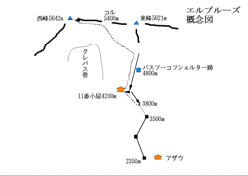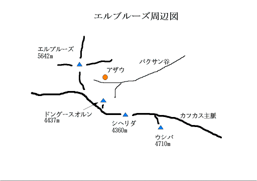 この日からエルブルーズ登山は始まった。 ロープウェイ2本とリフトを乗りついで3800mの氷河上に出た。谷底のアザウと違ってカフカスの高峰が連なる景色はすばらしい。周囲にカフカスの鋭峰がひしめく中でエルブルーズだけは火山性の緩斜面をもつ双耳峰である。日本でいえば北アルプスの上に富士山が噴出したようなものだ。従って下部は急崖だが4000m付近はすそ野にあたり広大で傾斜もほとんどない。1時間半で4200mの11番小屋。アルミ合金張りの大きなカマボコ形の3階建で、各国の登山者でにぎわっている。付近はポールが林立しゲレンデ化している。この日は11番小屋まで往復して日本食を荷上げしてアザウに戻った。