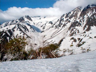 | 2000年6月3-4日 メンバー L:梅原, 作野, 武部, 丸山, 寸田, 橋本幹(記) 6月3日(土) 新宿駅から8時発のスーパーあずさで白馬へ。白馬駅でバスの寸田さんと車の丸山さんと合流、タクシーと丸山さんのバンで猿倉へ。途中中山沢にすさまじい雪崩の跡を見た。車を止めてスキーをザックにつけ、身支度をして猿倉を出る。 日差しはあるが、稜線はガスに隠れている。気温は高く、シャツ1枚で十分だ。夏道から林道を少し歩き、また夏道に入るが、なかなか雪が見えない。雪解け水で道は半ば川になっている。1430m地点で休憩。休憩地点の10分ほど休んで出発したが、いつのまにか夏道からそれてしまい、藪に行く手をはばまれるが、藪をこいで北寄りに進路を変え、夏道にもどる。 14時頃にやぶも薄くなり、スキーを板からおろしてつぼ足で歩く。小日向山に向かって次第に傾斜が強くなり、キックステップで登る。上からスキーヤーが二人降りてきた。きつい傾斜を登り終える頃、雨が降り始め、コルの手前で本降りになった。今日はあえてコルまで行かなくてもよいと意見がまとまり、まだ3時直前と少し時間は早いがテントを設営する。 テントを設営すると雨が止み、ここで一滑りするか、との魅力的な提案もあったが、再び雨が降り出してテントの中でお茶と食事の準備となった。この間、断続的に強い雨が降り、ときどき雷鳴が鳴り響いた。3-4人テントに6人が入ってすし詰め状態ながら、アルファ米のすき焼き丼の食事を終え、各自持ち寄った酒を飲みながら話す。梅原さんのマラソンsub 3 は努力さえすれば必ずできる、ただしその努力とは1ヶ月に300Km走ることとの話に一同圧倒された。 就寝は8時前。3-4人テントに4人がはいってかなり窮屈だったが、寒さは感じなくて済んだ。雨は夜半に止み、代わりに強風が吹き始めた。2時頃テントの外においたコッヘルの蓋が飛ぶ音を聞く。 6月4日(日) 翌朝は4時起床。快晴。ただし風は非常に強い2人用テントの前でコッヘルの蓋を見つけた。食事の準備をしながら日の出を見る。テントからポールを抜き、荷物をデポして出発。アイゼンをつけて強風の中を歩くが、雪も硬く、この調子ではとても稜線までは行き着けないと思う。6時に小日向のコル(1820m)へ。