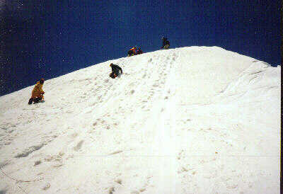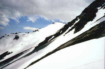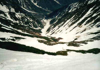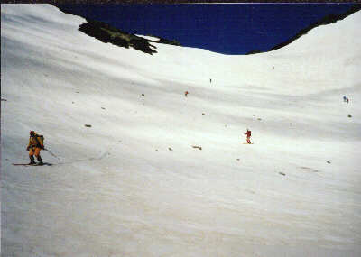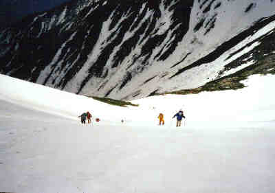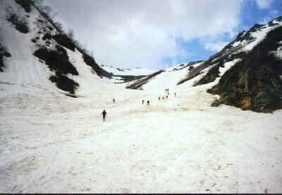 2001/5/19-20 メンバー YSD9名 5/19 晴れのち雷雨 扇沢に車で13:30ごろ到着。関東は晴れていたが、ここはかなり強い雨。雷も鳴る。今日は大沢のテント場まで行く予定だが、雨がやむのを待って入ることにした。時々小雨にはなるが、やみそうにない。結局、駐車場付近にテントを張ることにする。食後は持ち寄った酒を飲みながらの雑談。各自、さすが、酒だけはしっかり持ってきている。橋本さんは1Lのワイン。その他梅酒・日本酒等。明日は3時起きの5時出発ということで、21時に就寝。 5/20 晴れ時々曇り 夜は結構風が強くテントが揺れたが、雨はすっかり上がり、朝から天気は良い。3時起きは少々つらい。空を見ると、雲の流れがやけに速い。上の風は強そうだ。食事を済ませてテントも撤収し、出発。夏道からすぐにはずれ、沢沿いに進む。沢沿いは雪が途切れ途切れ続いている。 ![]() 50分ほどで大沢のテント場に到着。大沢からは針ノ木岳が見える。反対側の立山から見るとこの頂きは尖っているそうだが、ここからは針という感じはしない。大沢からは、皆スキーを引っ張ってつぼ足(アイゼン)で登る。はじめは緩い斜面で意外と長い。 ![]() 針の木雪渓とマヤクボ沢の出合いの手前に来て一服。マヤクボ沢を見上げると、結構滑り応えありそうな急斜面だ。ここでアイゼンをつけ急斜面に向かう。 ![]() マヤクボ沢を登る 10時ごろ針ノ木岳直下300mの緩斜面で休憩。ここから頂上への最短ルートは、途中ハイマツが出ていて、滑りは頂上から見て右に回りこむ必要がある。どこを登ろうかと考え、結局、マヤクボのコルを目指す。 ![]() コルよりマヤクボ沢上部 15分でコルへ。ここから見るスバリ岳の斜面はよさそうだが、かなりの急斜面。スキーやボードのシュプールがついているが、今回は見送り。ここから2600mまで滑って戻り、頂上へ行く人のみ、最短ルートで登り返すことにする。滑ると雪に引っかかり、やや滑りづらい。2600mから再びスキーを引っ張り、つぼ足で頂上を目指す。 ![]() コルよりマヤクボ沢を滑る 12時、針ノ木岳頂上へ、自分は初めての登頂だが、西川さんともなると4回目らしい。よく晴れて展望抜群。朝の強風も弱まっている。剣、立山、薬師、水晶岳と見渡せる。 ![]() 針の木岳頂上より御山谷・立山を望む 頂上直下の10mほどの雪の壁は70,80度あり慎重につぼ足で下る。やはりピッケルは持っていたほうが良い。 ![]() 12時過ぎ、いよいよ大沢までの滑り。2600mまでの300mをハイマツの右を回り込んで、マヤクボ沢を滑る。まあまあの雪質。針の木雪渓との出合いで急斜面は終わる。結構滑り応えあり。 ![]() マヤクボ沢より雪渓下部 ここから大沢までの緩斜面を滑るが、途中の古いデブリ跡は小石が散乱していて、板のソールが小傷だらけに。堰堤を一つ越えた所でスキーを外す。下界はもう夏だ。ほんと暑い。雪山をやっていると、春の新緑を味わう暇もなく、一気に夏が来る。扇沢へ14時到着。大町温泉郷で疲れを癒す。針ノ木岳はこの時期アプローチしやすいせいか、かなりたくさんの人が居た。滑り納めには良い所だ。 |