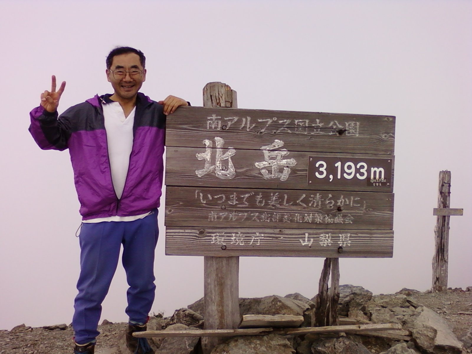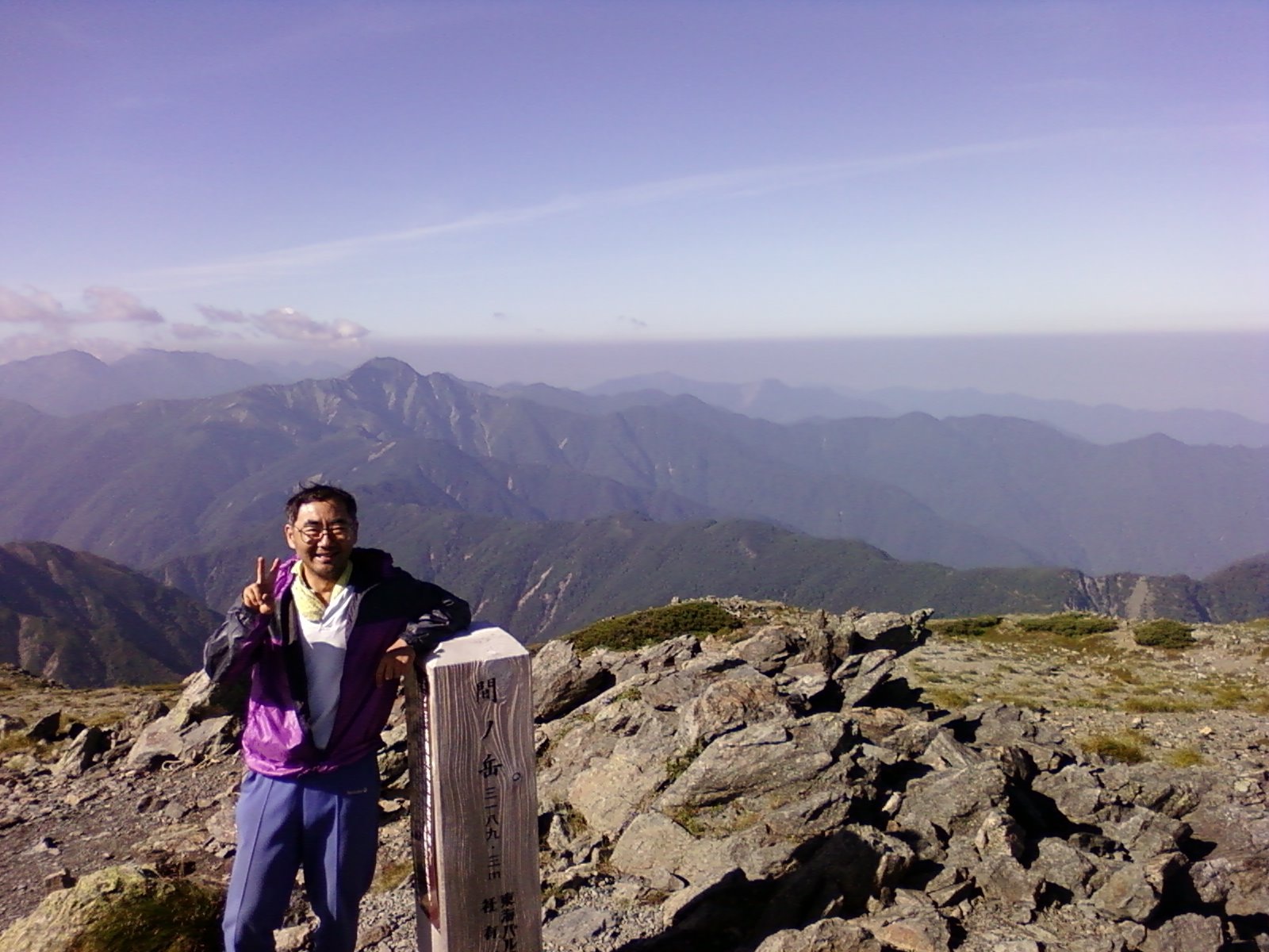 | 2010 8/15 曇り メンバー:武部 広河原の吊り橋からは、遠くに雪渓が見えた。八本歯経由のコースでも、コース上ではほとんど雪は無いとのことで、今回は荷物が重いし結局軽アイゼンはカットした。上部はガスで思ったよりも涼しい。しかし登りだすと汗だくだくで、荷物は思いしもう20分毎に休みという状況だ。休む度にタオルを絞ると雑巾のように水が絞れる感じだ。なんとか登りが終了して、後小屋まで30分の標識を見たときにはホッとした。小屋周辺は高山植物が多く、水も有りいいところだ。 広河原12:10―――白根御池小屋3:10 8/16 晴れ、曇り 朝の涼しいうちに高度を上げたいので、遠回りだが肩経由で登ることにした。傾斜は急で昨日と同じように休み休み登る。暑くなる頃にはなんとか稜線に出ることができ、甲斐駒、仙丈が見えて良かった。北岳に着くころには雲が出て、あまり展望が良くなく残念であった。山頂では、光岳から縦走して2週間目とかいうほとんど空身の元気な学生のパーティが登ってきて、計20日で南ア全山縦走するとのことであった。今日は熊ノ平から往復とのことで、今日は重荷から解放されたピクニックみたいな感じであった。北岳山荘のそばまで下ると、間ノ岳が大きく感じる。暑くてとても登る気がしないので、今日はもう北岳山荘にテントを張ることに決めた。ジフィーズの「そば」を作ったが、あまりうまくはできなかった。でもそれなりにうまかった。 白根御池小屋5:30―――二股からの分岐7:40―――肩ノ小屋8:40/50―――北岳9:40/10:20―――北岳山荘11:30 ![]() 北岳山頂 ![]() 北岳山荘からの日の出 8/17 晴れ 今日は昨日の分も登るわけだが、多少荷物が軽くなり、早朝の涼しいときに間ノ岳を登る分楽だ。中白根山からは、はるか遠くに塩見岳が見えた。ここまで登ると思ったよりも早く間ノ岳に到着できた。ここからは、西農鳥岳、塩見岳、さらに赤石、荒川方面まで見えた。熊ノ平分岐まで下って、ここでサブザックになり農鳥岳往復。荷物が軽いということはすごいことであると改めて感じた。西農鳥に登る途中で雷鳥の親子に出会った。帰りもまた出会った。西農鳥から農鳥岳はかなり下るのとそれなりに距離もあって結構遠かった。 農鳥岳ではさすがに人も少なくなり、静かな感じだ。ここから東は雲で何も見えない。間ノ岳、西農鳥岳、塩見岳は見える。西農鳥〜農鳥岳の稜線からは、熊ノ平〜塩見岳間の稜線が良く見え、改めてその長さを感じた。また、塩見岳手前の北俣岳への登りはかなり急そうに見えた。(実際そうだった)西農鳥の下りからは、今日これから行く熊ノ平へのトラバース道が見えるが、出だしが見えない。また、後半の広い沢ではガレが大規模に崩れたことがはっきりわかる。 熊ノ平分岐からは、どっと下って一気に登り返し、熊ノ平へのトラバース道にたどり着いた。ここからは水場が2回あって、ついつい休んでしまう。ガレ場の通過は長く、崩れたのはもう何年も前の出来事のようだ。三峰分岐からは、お花もあってよかった。 小屋の天場では隣のテントは学生で、三伏から来たとのことであった。行動時間11時間半で、2時出発とのことであった。 一気に三伏〜熊ノ平を行くのは、やはり学生だからできることだと思う。 北岳山荘5:40――間ノ岳7:30/8:00――熊ノ平分岐8:55/9:05――農鳥岳10:30/55――熊ノ平分岐12:30/50――手前の小さな水場1:30――水場2:00――三峰分岐3:00――熊ノ平小屋3:40 ![]() 間の岳山頂 バックは塩見岳 8/18日 晴れ、霧、夜雷 今日もいい天気のようだ。安倍荒倉岳からは塩見岳がよく見える。北荒川岳手前までは、ほとんど樹林帯なので日陰で助かる。北荒川岳のそばで三伏方面から縦走してくる学生のパーティに会う。実は翌日も塩見岳で三伏方面から縦走してくる学生のパーティに会い、ほぼ毎日どこかの学生が三伏〜熊ノ平を通過している感じだ。北荒川岳周辺とその少し先からは森林限界を越えて直射日光が当たるので暑い。腕はもう日焼けで真っ赤なので、タオルを巻いている。この暑さの中で塩見岳への急斜面を登るのはちょっと難しいので、もう泊まることにした。やはり10時頃から3000m峰に登るのは、ちょっと暑すぎると思う。 自分が稜線から外れてテント場(昔はテント指定地であったが、現在はテント禁止になっている?)に向かう前に、1人の人がその先の水場に向かっていた。テントを張って干し物をしていると、やっとその人(昨日熊ノ平で会った人)がやってきた。(50分位はかかっている)どうも水場までは迷路のようで、水5リッタをかついで「蝙蝠へ行く」とのことであった。暫くして自分も水汲みに行ったが、樹林帯に入ると天場がいくつにも分かれていて迷路であった。結局全て辿ってなんとか沢にたどり着いた。昨日熊ノ平で会った人は、「下に下りだしたら水場へのルートは間違いだ」と言っていたが、いろいろ行ってみたが結構下った。もっといいルートがあるかもしれないが、沢に降りたところには「ケ
