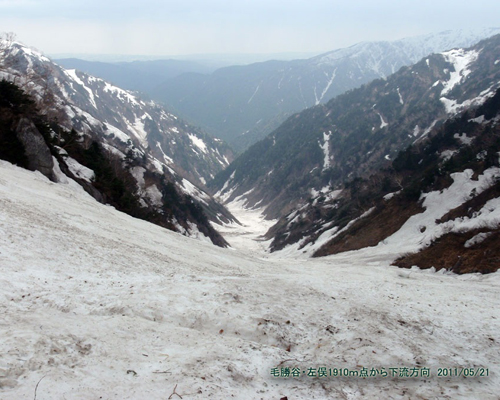 | 2010年5月20日〜21日 メンバー:菅澤、田中(秀) 5/20 練馬IC 08:00== 13:00魚津IC== 片貝第四発電所==14:00除雪終了点==16:15片貝山荘 魚津ICから片貝川に沿って20kmほど進むと片貝第四発電所があり、その先に通行止めの看板があったが気にせず車を走らせる。そこから3km弱で片貝山荘に到着するはず・・・だった。 車を降り林道を登っていったがなかなか見つからず、おかしいと思っているうちに北又13号堰堤に出てしまった。戻って東又林道に転進したが、雪が増え谷は悪相となるばかりで山荘は見つからない。車を停めた位置まで戻り、さらに250mほど下った対岸にある片貝東又(第五)発電所に尋ねに行ったところで発電所脇の片貝山荘を発見。ごくわかり易いところにあったのに発電所の施設と思い、車で通り過ぎてしまっていたのだ。2時間近くも板と靴を担いで林道をウロウロしてしまった。 片貝山荘は魚津市教育委員会が管理していて、事前に利用申請を提出して使用許可証を入手していたが、当日の利用者は私たち2名のみであった。平日のせいか。 二階建ての外観は古いが、8個室に分かれていて、改装されたと思われる二階は快適であった。発電所の元宿舎だけあって電気が点く。バケツで川の水を汲み上げて食事の支度をし、雪で冷やしたビールで乾杯。ウロウロした疲れが出てすぐ眠り込む。暑い夜だった。 5/21 片貝山荘(690m)4:50―(阿部木谷)―5:50最終堰堤(1040m) 6:10――6:40大明神沢出合(1250m)――7:25二股(1500m)――7:40三ノ沢出合(1600m)――8:40 1910m地点9:00――9:35最終堰堤9:50――10:20片貝山荘11:30==南又谷第二発電所 ==龍石神社== 14:00魚津IC== 18:30練馬IC 3:30 起床。風が生温かく気持ち悪い。天候とブロック崩壊、落石が気になる。 東又谷の右岸につけられた林道脇の雪に残りのビールを冷やしておいたが、一晩のうちに崩落していてビールの姿は見えない。帰りに掘り出すことにして東又谷を橋で渡り、クサリの車止めを越えて阿部木谷へ入る。 1kmほど歩いて堰堤を左岸に渡り、山荘から1時間で最終堰堤到着。先行したマウンテンバイクが2台停めてある。取水口となっている堰堤を右から乗越すと雪渓に出て、末端に運動靴をデポしてシールで登りだす。クレバスがあったりして雪面は最初から荒れ気味だ。 大明神沢出合付近で左の枝沢から落ちてくる雪塊を避けながら左に曲がり毛勝谷へ入る。このあたりから谷一面がデブリに覆われ登りにくい。三ノ沢出合からは傾斜も急になったので、板を担ぎ山アイゼンで登る。デブリがひどく板を引きずることはできなかった。 またも崩壊した雪塊がバラバラ落ちてきた。はるか下を登ってくる後続の登山者10名ほどに注意を促すと次々と「ラーク!!」の声が谷の下方へ引き継がれていった。 上部二股まで標高差100mほどのところで稜線からガスが下り始めた。落石が怖い。この先もデブリが続いているように見え、雨も落ち始めた。雨具を着け、しばらく様子をみたが、滑りを楽しめそうに無いので1910m地点を終了点とし下ることにした。 氷状にとんがったデブリ斜面は満足なターンができず、少しでも平らなところを選びながら滑っていく。田中さんの言う「デブリーランド」そのものだ。我慢の滑りを続けるうちにMPPとなる。まともに滑れたのは最終堰堤手前の400mぐらいだった。1986年5月24日の菅沼さんたちの山行時はどうだったのだろうか。 阿部木谷入り口まで下って、途中追い抜かれたマウンテンバイクの二人組に聞いてみると、上部二股から上はきれいな雪渓だったとのこと。残念。 山荘に戻る途中、崩落した雪をピッケルで掘ってみたが缶ビールは見つからなかった。 猫又谷へのアプローチ確認のため龍石神社(蛇石)まで車で行ってみた。谷は阿部木谷に比べてはるかに広くゆるやかであり、観光用の舗装道路が続いていた。残雪も見えず、谷の様子はずいぶん違う。 昼食を摂りに魚津市内に下り、天候予報を確認すると今晩は雷雨、明日は雨とのことなので猫又谷はあきらめて帰京を決定する。 時間があるので金太郎温泉でゆっくりすることにした。食塩泉と硫黄泉の混合泉で珍しい温泉らしい。ここでもマウンテンバイクの二人組に会い、野天風呂で話し込む。富山県スキー連盟に所属するデモで、春になると山スキーを楽しむとのこと。この頃になると下山決定時の天候が嘘のように晴れてきて、早計な判断が悔やまれた。 3/11に発生した東日本大震災の影響で予定山行がすべて中止となり、2/27の根子岳以来3ヶ月ぶりのシール登行で足が重く感じた。今回は消化不良の山行だったが偵察と割り切り、次回に期待したい。 帰りに名立谷浜SAで食べた潮騒ラーメンは旨かった。 菅澤記 ![]() ![]() |