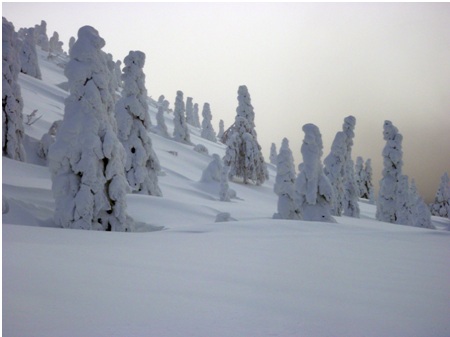 2012年1月9日〜12日 メンバー:田中(秀)、他会員外3名 会員4氏と別れ、知人と酸ヶ湯で合流することになり、都合6泊の酸ヶ湯暮らしとなった。フロント、仲居、雑用係の人達とも顔なじみとなり居心地がよい。彼等彼女等は約40名が交代して住み込み働きで、青森駅からの送迎バスは通勤バスの一面を持っている。さて、会員外3氏とは9日夕合流し、10、11日とガイドツァーを楽しんだ。 10日 午前中は前嶽に登り銅像ルートを滑る。ころルートは会員にも体験者が多く語る必要はないだろう。午後はツァーガイドのリーダー其田隊長が珍しく参加者の希望を訊いた。元々13:30スタートで行けるコースは限られているのだが中央ルートという少々クラシックな歩き主体のコースに行くことになった。田茂萢岳の南斜面を下りると大きな斜面はなく、樹氷原の散歩となっる。時折薄日の射す幻想的な冬の高層湿原・毛無岱を歩くことは、私達には気持ち良いがガイドは大変である。ガイドのS氏とH氏が交代で懸命のラッセルを続けるが、少しでも登る場面を無くそうとする隊長の叱咤は厳しい。これも普段は利用しないルートでのガイド教育の一環なのであろう、隊長の頭には木々1本1本のデータが入っているようでその指示は実に的確であった。 このルートのクライマックスはホームである酸ヶ湯温泉に飛び込む斜面である。そう、正面玄関・駐車場の左手に開けているバーンを滑り、ツァー打ち上げとなる。先に滑った人は誰もが次の人の滑りを注目し、宿の人やお客さんもギャラリーとなる。迎えのバスを待つことなく早々に温泉にも飛び込める極楽ルートであった。 以下参考タイムを記す。 13:30 ロープウェイ山頂駅発、田茂萢岳南西1230mラインから寒水沢1080m付近まで滑り込み、14:00毛無岱ヒュッテ跡着。小休止後、15:15酸ヶ湯上の970mライン着。15:20酸ヶ湯帰着。 11日 昨夜来の雪が激しい。定番の変形モッコ沢コースを午前中に2本滑る。ガイド氏の読み通りで雪は激しくなる一方である。午後もモッコ沢意外には出られない。2時間弱の昼食休憩の間に、午前中のトラックは全く消えている。臍までの深雪、舞い上がる雪煙でゴーグルは下面が凍り付いて曇り、緩斜面になると板は滑らず、前に進めない。この降雪の問題点はもう一つあった。虎バサミのような罠である。あまりの急激な降雪に足の太さもあるブナの大きな枝が折れる→雪面上に横たわる→フカフカ雪がそれを隠す→圧密されていない雪の中をスキー板トップが走る→横たわった折枝の下にスキー板が入る→大転倒、の構図である。折れ枝を探して上を見て滑ることもできずトップを滑る人は運を天に任すしかない。今回のトップは当然ガイド氏であるが彼は3回もこの災難にあってしまった。 12日 雪は一向に止む気配なく、むしろ酷くなっているようである。昨夜来の積雪は70p台とかで、今日はロープウェイを離れて遊ぶことはできず、下りもラッセルで苦労しそうだと昨日痛い目にあったガイド氏がぼやく。今日の帰京は結果正解であったようだ。 (田中(秀)記) ![]() 毛無岱付近の風景 |