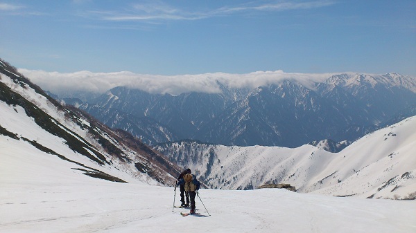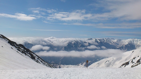 2012年5月1日(快晴) メンバー 作野(L)、今村、加瀬、矢野、久保田、武部 朝7:45頃 室堂山荘よりGPS記録開始、一ノ越に向けて登りスタート 8:45 一ノ越到着 絶景をしばらく楽しみました ![]() 《一ノ越にて、槍・穂高・笠岳を背景に記念写真(後立山連峰の向こう長野県側は雲海だ。)》 ![]() 《一ノ越・御山谷の滑り出しには、「下部雪無し、沢は流れが出ている。」の看板が》 8:55 御山谷滑走開始。超気持ちよかった! 9:15 大岩到着 ここで一休みしてからシールをつけ、登り返しの準備 9:30 登り返しスタート 10:15頃 竜王のカール下部のボウル状部分まで登ったところで、今村と武部さんはボウルを右に見ながらトラバース。他のメンバーは、ボウルを左に見ながら小屋方向へ登行。 10:30 今村、武部さん、加瀬さんは竜王カールを滑るために大きくジグを切りながら稜線に向かいました。 10:50 稜線に着き、そこからは稜線沿いに直登 11:30 標高2740m付近でシールを外し、滑降することにした。斜面が見通せるところまで少しトラバースし、加瀬さんからドロップイン!雪は柔らかくて少し重かったが、広々したカールの中の滑りは迫力もあり、とても楽しめた。 11:45 あまり下まで滑ってしまうと登り返しが大変なので、2600m付近の岩がこちゃこちゃっと固まっているところを目掛けて滑り、シールをつけて一ノ越へ登り返し。 ![]() 《御山谷の最後の登り返しです。》 12:10 一ノ越到着。作野さんたちが待っていてくれました。ここで一休み 12:20 一ノ越から北西方面へ滑降開始。雄山下の広々した斜面のすべりはとても気持ちが良かった! 12:40 称名川にあるブルドーザー道に到着。今日の滑りはここまで!とても充実した一日でした! 13:10 みくりが池温泉到着!お風呂に入ってビールで乾杯! (記録 今村さん) ![]() 《GPSトラック》 |