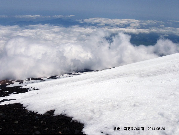 富士山・須走口(春スキ−) メンバー:加瀬、田中(秀) 納会山行に参加できずフラストレーションが溜まっていたところに吉田口を滑るというIさんのメールが流れた。早速、滑り納め場所を探していた加瀬さんに連絡、明日朝6:30五合目駐車場集合と決まった。但し古傷を抱える還暦超組は少々日和って須走口とした。 拙宅からは富士山は最もアクセスが容易、須走口ならば距離104Km、圏央道・中央・東富士五湖道路経由で1時間半、今朝は4時に自宅を出て5時半着であった。ほどなく加瀬さんも到着、朝食、うたた寝をして7時出発に備える。 ほぼ快晴、風はほとんど無い、気温は+数度か地面には氷が張っている。富士を仰ぐと既に7合目近くまで人影が点在、駐車場にいた人達のほとんど出発していた。膝のリハビリ中とは思えない加瀬さんのハイピッチに息を切らしながら砂払い五合目を過ぎ、板を履ける程の雪面が現れたのは2,340m付近であった。 初心者と思しき単独行の若者、我々より若干先輩らしきやはり単独行者を抜き順調に登るが、30前後の若者3人組はエネルギッシュな歩きには敵わない。彼等は大きく御殿場側の沢筋にルートをずらしていった。 小生は2,790m点で、加瀬さんは3,100m点でクト−を付ける。ディナフィットTLT用のクトーは先端部のヒンジ構造で止めているだけなのでサポートを使用すると雪面に対する噛み込みは甘くなり効かなくなる。これを何とか出来ないかと加工した物を小生は今回持参し、その効果を確認した。経6mmのロングボルトを板の滑走面側でクトーのエッヂに穴を開けて通して固定する簡便な物だが、効果に問題はなくも寒い中で蝶ナットの締め付けが難しく、想定通りとはいえ改善策の必要を痛感した。 3,000mを超してから気温が低く感じられてきた。板やブーツに着く雪氷片も水滴にならない。3,330mの岩が露出している場所で大休止をとる。この尾根状になった場所から吉田側の通常ルート(須走ルートの夏道沿い)は風当たりのためかカリカリのアイスバーンとなっていた。再び登り始めたが、加瀬さんが足に違和感を感じていること、雪面が酷くなる一方なので20m程上がったところで今回の終了点とし、滑走準備に入る。この時、9合目付近から滑ってきた2人組の1人が転倒し暫く動けないでいた。彼等は私達の100m位上から大きく御殿場側にトラバースしていった。やはり登ってきたルートは未だ雪が固く、彼等に倣い1本御殿場側の沢筋を狙うことにする。 ルート取りは正解であった。時折ビデオを取り合うなどしてザラメ雪を存分に楽しむ。2,450m以下は凹凸の激しい狭い沢となるの慎重に下り、2,340m点で板を脱いだ。降りてきたシュプールを写真に撮ろうとした時、更に御殿場側の沢筋に7〜800mも一気に降りた見事なシュプールに気が付いた。犯人は朝一緒になった3人組であろう。あれを来季の目標にしよう。 |
