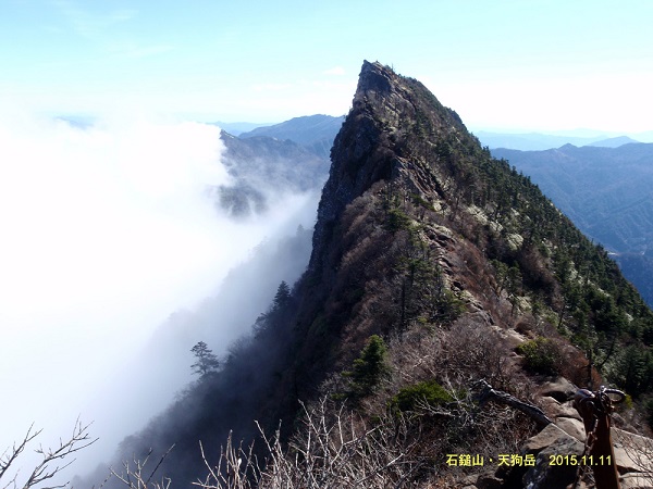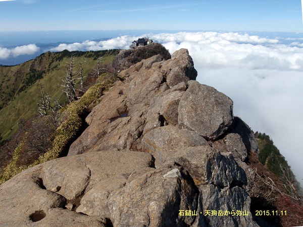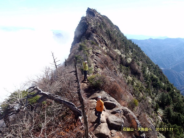 L岡坂、田中秀和、小森宮(記)敬称略 11/07 新横浜を岡坂さんの車で出発し夕方には琴平の岡坂さんの家に到着した。 早速近くのうどんの名店『むさし』で本場讃岐のうどんデビュー。 私はカレーうどんを食べたが思いの外スパイシーなカレーが『もちもちうどん』との相性も良くカレーと出汁のコラボのおいしさが絶品。ごちそうさま。 夜半に日本海を東進する低気圧から伸びた寒冷前線の通過で激しい雨になった。 11/08 曇り時々小雨 前線通過の影響が残りはっきりしない天気。 雨に濡れた山道は危ないという事で、本日は岡坂さんの案内で史跡めぐりとなる。 平安時代がその始まりという日本一の溜池『満濃池』や、豊稔池ダムを巡る。豊稔池ダムは、香川県観音寺市にある現存する日本最古の石積式マルチプルアーチダム。という事で土木工学が専門の田中さんが目を輝かせる。 昼食は、まんのう町の『長田うどん』でもちもちの釜揚げうどんを食す。 昼過ぎは金毘羅詣で。足慣らしも兼ね金刀比羅宮奥社まで1400段程の階段を30分ひたすら登った。 帰りは金毘羅歌舞伎の舞台見学やら、銘酒『金陵』の蔵元を訪ねる。 11/09 曇り時々小雨 本日も前線通過後の影響が残っているのか、はっきりしない天気。 小雨の中、20km程車で走った所に在る岡坂best5のトップ。名店『谷川米穀店』に向かう。11:30に着いて列に並ぶと程なく本日ここまでの看板が列の最後に出され滑り込みセーフ。丼に湯切りしたうどんを盛り、青ねぎと青唐辛子の醤油漬け少々を乗せ、さっと醤油を回しかけただけのうどんがやたらうまい。思わず小盛りを3杯食べてしまう。 11/10 四国 剣山 山行記録 曇り時々晴れ L岡坂 田中秀和 小森宮 日本百名山の一つ、剣山は穏やかな山容の優しい草地が特徴的な山だった。 なんとか天気も回復傾向となり、車で琴平から山越えで徳島県へ。 吉野川を渡り、貞光川沿いの山間の道に入ると剣山登山口への道は、途中ひたすら狭く待避場所を使わないと、すれ違いも出来ないような道が続く。 途中の集落も急傾斜の山の斜面に貼り付くような具合で、田中さんが『これじゃ東洋のマチュピチュだね』と言うのも納得。ワインディングロードで私は少々車酔いになってしまった。車で北西側の登山口、見ノ越に到着。 見ノ越 1400m 08:45→ロープウェイ西島駅 1750m 09:20/09:25→大劔神社(夫婦岩)09:45/09:50→山頂に近づくとミヤマクマザサの草原保護のため、ロープが張られ木道が敷かれている。 剣山山頂 1995m 10:05/10:10 山頂から南西側に伸びる尾根をたどり次郎笈(じろうぎゅう)に向かう。次郎笈峠 1777m を経由し次郎笈山頂 1930m 10:45/10:50 振り返ると剣山山頂辺りの草原が見事だ。 往路を戻り、11:20 途中の1807m分岐から山頂を巻く道を経由して下る。下り始めると、じきに曇り始めてしまう。 11:25 夫婦岩を下から見上げる道で赤い花が沢山咲いている木があると見えたのはマユミの木で、桃色の皮が割れて赤い実が顔をのぞかせているという事を後から知った。 →西島駅 11:45/11:55→見ノ越 12:15着 帰りは香川県三豊市にある『たからだの里 環の湯』でのんびり湯に浸かってから戻る。 ![]() ![]() 11/11 四国 石鎚山(成就社コース) 山行記録 晴れ時々曇り L岡坂 田中秀和 小森宮 日本百名山の一つ石槌山は前日の剣山とは対照的に、険しい岩場が特徴的な男性的な山だった。 四国も最終日。ようやく天気も回復し琴平から車で西へ。 高速道路も使いながら愛媛県西条市の石鎚山登山口へ向かう。 ロープウェイ脇 駐車場着 08:00 石鎚登山ロープウェイ山麓駅 08:40 始発に乗車し8分ほどで頂上駅着。08:55 出発 石鎚神社中宮成就社では田中さんに倣い無事を祈念。 09:10 成就社を出発。成就社から八丁坂を1kmほど下った所からは、木の階段の登りが延々と続く。前社ヶ森(1592m)の岩峰にかかる「試しの鎖」(74m)は岩 が逆層の上に、雨に濡れていて所々鉄のアブミに足を通しながら慎重に登る。 後日、4つある鎖場の内でここが最も急勾配で長いという事を知り、知らずに登って良かった。 前社ヶ森(1592m)10:10 夜明かし峠 この辺りで妙に生ぬるい風が吹き抜けていてガスが盛んに湧いている。 弥山までの3つの鎖場は迂回路もあるが 「一の鎖」(33m)と「二の 鎖」(65m)を登り「三の鎖」(67m)は『工事中通行止』の標示がありパス。私はほっとするが、田中さんの非常に残念そうな顔。 「三の鎖」下部を出発し迂回路から登る。11:10 ガスで山が見え隠れしていた天気も、山頂手前ですっきりと晴れ渡る。 石鎚神社山頂社がある山頂の一つ、弥山に到着 11:15 標高1974m ここから短い鎖場を下ってもう一つの山頂、天狗岳に向かう。 弥山からの稜線左側はオーバーハングのスッパリと切れ落ちた岩壁でこういう所が苦手な私はこわごわ登る事に。 天狗岳 標高1982m 四方が晴れ渡り絶景。11:35/11:40 下りは鎖場は迂回路を下る。下り始めると、すぐにガスに巻かれて辺りの展望が無くなってしまう。 急な個所は手摺りの付いた鉄製のりっぱな階段が続く。 12:20 夜明かし峠 夜