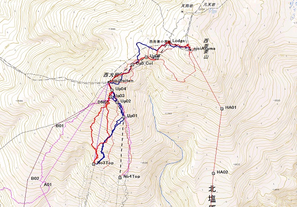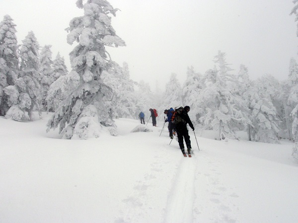 ・日 程:1月9日=西大顛(1,982)(吾妻連峰) −グランデコスキー場から、標高差約390m 1月10日=西大顛→西吾妻山(2,035)(吾妻連峰) −グランデコスキー場から、標高差約450m 1月11日=箕輪山(1,728)(安達太良山) −箕輪スキー場から、標高差約350m ・地形図名:吾妻山、安達太良山 ・参加者:L田中 秀和、菅沢 秀秋、加瀬 幸男、ふくちゃん(11日L)、いっちー、野村 勉 ・行動報告 1月 8日(金) 佐野SAに集合(田中車/ふくちゃん車)して、現地に向かう。 1月 9日(土) 天候:曇時々雪 雪不足のせいか、グランデコに向かう道が渋滞して、思ったより時間がかかった。 雪不足のせいか(くどい)、グランデコのリフトがとても混雑していた。 12:00 リフト最上部から、シールを付けて歩きだす。 針葉樹の枝に苦しめられながら、帰りの滑降を心配して登る。 久しぶりに樹氷をみることができ、嬉しかった。 13:40 西大顛頂上到着、先行パーティーが東斜面を滑るのを見送る。 13:55 寒いので、早々に準備して滑走開始する。 南斜面若干西寄りのコースをとり、沢に入る前に出発地点を目指す。 14:40 出発したスキー場上部に戻る。 1月10日(日) 天候:曇時々雪 二十日平に降りるコースを諦め、西吾妻山往復に変更する。 09:15 前日同様、リフト最上部から、シールを付けて歩きだす。 10:50 西大顛頂上到着。 11:10 視界の利かない中、メーンイベントの東斜面を滑る。 11:20 滑走終了、西吾妻山へ向けての登行の準備をする。 針葉樹の枝に難儀し、多少大回りしつつも登る。 12:35 西吾妻小屋到着、天元台から来たパーティーに出会う。 12:55 西吾妻山到着、寒いので早速シールを付けたまま出発する。 13:25 再度西吾妻小屋到着、小屋の中で休憩する。 14:35 再度西大顛頂上到着、久しぶりにシールを外して滑降の準備をする。 ほぼ真南に向かって樹林帯を滑ったが、まあまあ深雪があった。 15:15 出発したスキー場上部に戻る。 1月11日(月) 天候:吹雪 田中L、菅沢さん、加瀬さんが、体調不良を理由に帰ることとなった。残念! 箕輪スキー場は、グランデコほどは混んでいなかった。 10:00 リフト最上部から、シールを付けて歩きだす。 至る所に灌木が頭を出している中を登る。 11:10 箕輪山到着。猛吹雪で、灌木あり、ときどきもぐるし、視界はほとんどない。 11:55 東斜面の状況確認を諦め、降ることにする。 13:10 スキー場上部を通過してしまい、1380m辺りでリフトをくぐってスキー場に戻った。 ・感 想:11年振りの西大顛(西吾妻(天元台)は15年振り)だったが、雪は格段に少なかったように思う。 箕輪山(初登頂)は、スキーを使った登山であった。 2度にわたってシールトラブル(剥がれ)を起こし、深く反省した。 9日と10日は、何とか深雪を楽しむことができて良かった。 (記 野村) ![]() ![]() ![]() ルート図 (写真&ルート図 田中(秀)) |