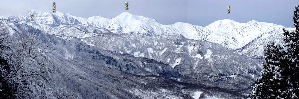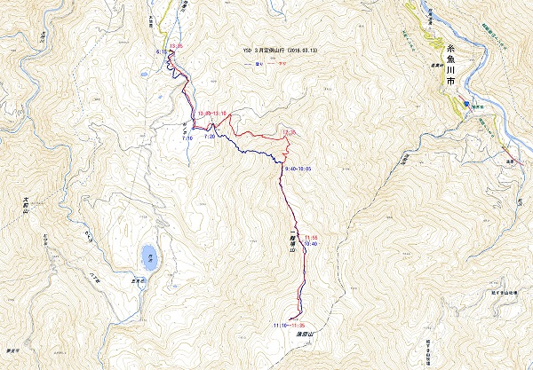 参加者:L;田中(秀)、M:西川、岡坂、梅原、かえどん、いっちー、ふくちゃん、おおちゃん、野村/計9名 コースタイム: (→は車・鉄道、>>はシール登行、歩行 〜〜は滑降) 3月12日(土) 各自夕刻までに宿・ホテル白馬荘 (姫川温泉)へ集合 3月13日(日) 宿 5:45 >> 5:55 木地屋除雪終点(680m) 6:15 >> 7:10 杉ノ平渡渉点 >> 7:20 916m点 >> 9:30 北尾根1,360m 10:00 >> 10:40 一難場山(1,518m) >> 11:10 蒲原山(1,629m) 11:35 〜〜 11:55 一難場山 〜〜 12:10 北尾根1,360m 〜〜 12:35 1,178m点 〜〜 13:00 916m点 13:10 〜〜 13:35 木地屋除雪終点 3月12日(土) 各自夕刻までに宿・ホテル白馬荘 (姫川温泉)へ集合 田中(秀)、かえどんは木地屋の除雪終了点で積雪状況確認、折よく下山してきたスキー登山者から渡渉点の状況等を聞く。 3月13日(日) 星が残る早朝に宿を出、枝沢を渡る橋を過ぎた除雪終了点に6時前に到着。昨日からと思われる1台が駐車していた。 天気は晴れ、微風、午後には下り坂との予報。 c790mライン林道が大きく右に曲がる地点で山に入る。杉ノ平は山毛欅優勢林の平坦地、地図上林道が川と交叉するポイントより百数十メートル先でスノーブリッジを渡り左折、トリッキーな小尾根上の916m点に出る。ここから一難場山の北尾根が間に大きな無木立斜面を抱えて、北と西に小尾根を派生させているc1,300m付近を目標に西側の小尾根を辿るように登る。しかし、積雪不足で笹や藪が煩わしく、斜度も厳しくなりc1,250mラインからは全員四苦八苦の体で汗を流す。c1,250mラインからもう少し左に廻り込むべきであったか、しかし、帰路にその辺りを振り返れば近くには雪崩跡が付いていた。正解は下山に使用した1,178m点のある北尾根の延長を登ることだと思える。 やっと辿り着いた北尾根上の1,360mで大休憩、小枝を飾る新雪がキラキラ光る美しい。元気を取り戻し蒲原山を目指す。広い疎林の尾根で快適、黒負山、五輪山、朝日岳へと続く雪山が見えるようになるが、樹林に煩わしく写真には今一。 一難場山は意識しないと気付かずに通過してしまう目立たないピーク。蒲原山到着は予定より1時間半遅れとなってしまった。朝日岳から雪倉、小蓮華 、白馬乗鞍の山々、近くは風吹の箙岳、横前倉山が見えるも残念なことにガスが掛かり始め、モヤってしまった。 遅くなったことから蒲原沢c1,440m点への滑り込みは中止、一難場山までの西側で滑れそうな斜面を探しながら、結局は往路を戻る。登りで休憩を取った1,360mからは、そのまま北への無木立の小尾根を滑る。雪は少々重いがノントラックで歓声が上がる。1,178m点からは林道跡を辿りながら杉ノ平に戻った。 記 田中 秀和 【動画】蒲原山(撮影:おおちゃん) |