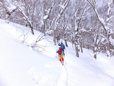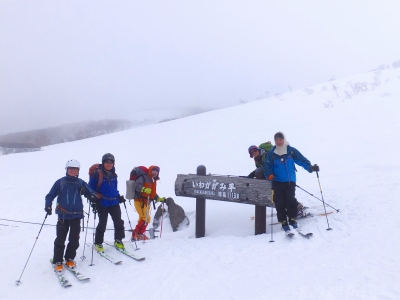 日時:2017年3月25日(土) 参加者:CL岩、SL菅澤、加瀬、川島、武部、かえどん(全6名) 記録:宮城県内水面試験場(標高550m,小雪)625・・・930三光の宮と1190ピークの間のコル(1180m,曇)・・・1040升沢小屋(1225m,晴)1100・・・1240船形山(1500m,霧)1300〜升沢小屋(晴)1335〜三光の宮と1190ピークの間のコル1425(晴)〜1520(晴)宮城県内水面試験場 5年ぶりに登る船形山は、期待を裏切ることなく、やはり達成感のある、また登り甲斐のある山だった。 今週火曜(3月21日)以降の花冷えのお陰で登山口で20センチ、山中では更なる降雪で心配していたシートラーゲンは無く、逆に、中間部はシール登行に最適な積雪、上部は快適な新雪が楽しめた。 金曜日3月24日午後、まずは下見する。積雪量が心配だった。結果、積雪十分でひと安心。ただ、駐車スペースが狭く3台程度しか止められない。ともかく明日は早く登山口に来たほうが良さそうだ。夜各車とも午後7時には宿に着いたのでちょっと前夜祭をやって景気づけをした。 翌朝3月25日(土)5時、ホテルを出発、小雪ちらつくなか、雪道に車を走らす。駐車スペースのこともあり、一番狙いだったが、雪道には明らかに先行車の存在がしっかり残っていた。結局3台目だった。まだ2台とも準備中だったので、佳恵が寄せてくれるよう頼み、なんとか、岩車、加瀬車とも入る。 朝6時20分すぎ先行者を追って登山口をスタートする。新雪を踏みながら先行者のトレースを追う。ゆったりとした、しかし、長〜い登りだった。登り出して20分すぎ、丸い看板様の板に赤地に白抜で28と書かれた標識を見つける。赤のペンキがまだ鮮やかで作られたばかりのかんじ。登るに従いこの数字が順に小さくなっていく。やや急な登りが出だしにあるだけ、あとはブナの森の中を単調で緩やかな上りが続く。菅澤さんは眠気との戦いだったとあとで聞いた。標識の数字が22をすぎたあたりから、尾根上のピークを二つほど右(北側)にトラバースして登ると17番の標識が見えてくる。そして、左にこんもりとしたピークが出てくる。三光の宮である。ここまで3時間。心配だった左膝はここまでは快調 。とはいえ、いつもの非常にゆっくりなペース。一緒のメンバーには申し訳ないペースだ。標識の数字はどうも登山口が30のようなので、ここ三光の宮はおおよそ中間点。