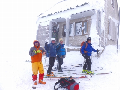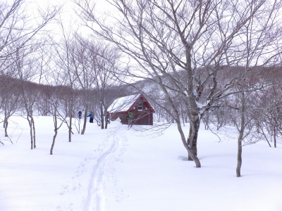 三光の宮に着くと丁度正面前方に、とても目立つ三角形の山を望むことができる。思わず船形山と言ってしまうがそれは大間違い。これは蛇ケ岳である。ここに来ると毎度、蛇ケ岳を船形山と間違え、登ってしまう。今日はよく気を付ける。まだガスでまったく見えない船形山に向う。蛇ケ岳を12時とすると3時の方向に大きく舵をきる。蛇ケ岳の東の裾野を1200メートルの標高線に沿って大トラバースである。先行者のトレースは蛇ケ岳の方向に向かっていたので別れる。途中ようやく船の形の山が前方上方に見えだす。純白の大斜面がガスの中から現れる。改めて気合いが入る。30分ほど行くと10番の標識が見える。このトラバースが正しいことを確信できた。さらに30分トラバースしたあたりで川島さんと佳恵が升沢小屋は左の台地ではないかと言う。ここに来るたびに、登りすぎて結局小屋に向かって滑り下るというトラウマがあり躊躇する。菅澤さんにGPSで見てもらうとどうも、女性陣の言うとおり左の台地らしい。菅澤さん先頭に20メートルほど登ると升沢小屋があった。佳恵から、ほら、あってるでしょ、と。 升沢小屋
