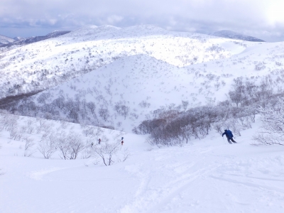 下部こそ、とんでもない雪質だったが、とても充実した山スキーだった。東北らしい山スキーとなった。夜の祝勝会のビールが旨かった。 翌、3月26日(日)は、栗駒山を目指すも、ガスが濃く、登山口の元いこいの村駐車場からいわかがみ平まで登ったところで断念とした(時間不詳)。この日、すでに、いわかがみ平の途中まで道路の除雪が進んでいてルート取りに留意が必要だった。道路の除雪も考えるとこの山は3月半ばまでが望ましいかも。元いこいの村駐車場は20台以上のスペースがある。厳冬期でもここまでは除雪が入っているようだ。栗駒山は、また、次回のお楽しみとする。