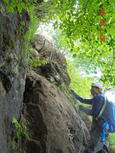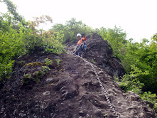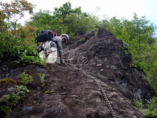 更に稜線上を歩いて隣のピークを踏む。大砲岩への下り口を過ぎ、先に進んで次のピークは東岳。 此の辺りから鎖場は下りに出てくる。ルートほぼ垂直に近く,しかも足元は見え難い。慎重に下る。鎖の径が本当に太い物もあってそれを掴むと安心感がグット増す。