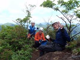 表妙義・中之嶽神社駐車場〜第一石門〜ホッキリ(堀切)〜鷹戻し〜東岳〜中之岳〜駐車場 メンバー・L:菅澤 M:岡坂、田中(秀)、千葉 計4名 5 月27 日(土) 光が丘〜練馬IC〜松井田・妙技IC〜(東雲館) 本日の車は岡坂車 光が丘で菅澤さん、高坂SA で千葉をPU して松井田・妙技IC に向かう。天気予報では晴れの予報だが生憎空は曇っていて少し肌寒い位の温度。 夕方今日の宿『東雲館』に到着。妙義神社の直ぐ手前で妙義山の前風景が良く見渡せるロケーションとしては調度良い場所でした。 間口の広い玄関を入ると正面受付の左隅にかなりの数の登山用具の数々が無造作に置かれていた。3 人とも昔の道具に見とれて暫し道具に触ったり、撫でたり して嬉しいやら、懐かしいやらの道具談義に盛り上がった時間でした。 中にはどうして使うものなのか解らない物もあって宿の主人に尋ねる始末でした。 夕飯は宿の主人自慢のオーディオルーム兼食堂でクラシック音楽の中での食事でした。 ビール飲み放題のサービスもあり楽しい時間はあっという間で早めの就寝となりました。 5月28日(日) 野鳥のさえずり(オーディオ)の流れる食堂で朝食をとる。食べ終わる前に今日合流する田中(秀)から駐車場に着いたとの連絡が入った。大急ぎで身支度を終えて宿を出た。 車は中之嶽神社駐車場に向かう。思いの他遠く感じる。 中之嶽神社駐車場で田中(秀)さんと合流する。短パンの下はタイツ 若々しい姿だ。 神社の入り口には巨大な金色(言い過ぎかな)のだいこく様 剣を持つだいこく様は珍しそうで高さ20mの日本一の大きさとか。裏山の風景に埋もれる事無く実に堂々として圧巻だ。 駐車場から神社前を今来た方向へ向かって歩きだす。暫く歩くと道路の左方向に第一石門入り口の標識が見えて来た。ここから登山道へ入る。道は昨夜降った雨の為落ち葉も岩も濡れている。時折体に触れる木々も濡れていて先頭を行く田中(秀)さんは正に露払いの役目。ありがたいです。足元が滑らない様に慎重に足を運ぶ。 しだいに絶壁が現れる。巨大なアーチ状の岩が現れてその下を潜って先に進む。この先ハングした岩場は腰を屈めて通る。ここまで登ってきた道は一転右の谷に向かって稜線上の鉄階段を降りて行く。鉄の階段は両側に手すりが付いていて安心感があるものの右の谷も左の谷も谷底は全く見えない。ここは手すりが無いとかなり神経を使う場所だ。暫く行って道の左に宿の主人が言った目印のCDを見つけた。この場所がホッキリ入り口だ。1回目の一休みとする。 ホッキリまで登り此処で小休憩。ヘルメット、ハーネスを身に着ける。これを付けると今までとは違う身の引き締まる感じがして来た。長めのスリングにカラビナ、確保機を腰に提げる。岡坂さんはヴィアフェラータ用のカラビナを腰にする。身支度が終えた処で菅澤さんをトップに鷹戻しに向かって出発する。 コースは時に表妙義側、裏妙義側とジグザグに稜線上をぬって進む。心地良い緊張感があって気持ち良い。この頃になると太陽が出て木立の隙間から遥か遠くまで良く見える。 いよいよ鷹戻しの鎖場。鎖に全体重をかける事が無い様に片手で鎖 片手で岩のホールドを掴みながらバランスを取りながら慎重に登る。先行者が鎖の支持箇所を通過の合図を待って後続の者が登り始める。 時々足場の良い場所で自分の番を待つ。その僅かの間も緊張感はある。田中(秀)さん、岡坂さんが写真を撮ってくれる。