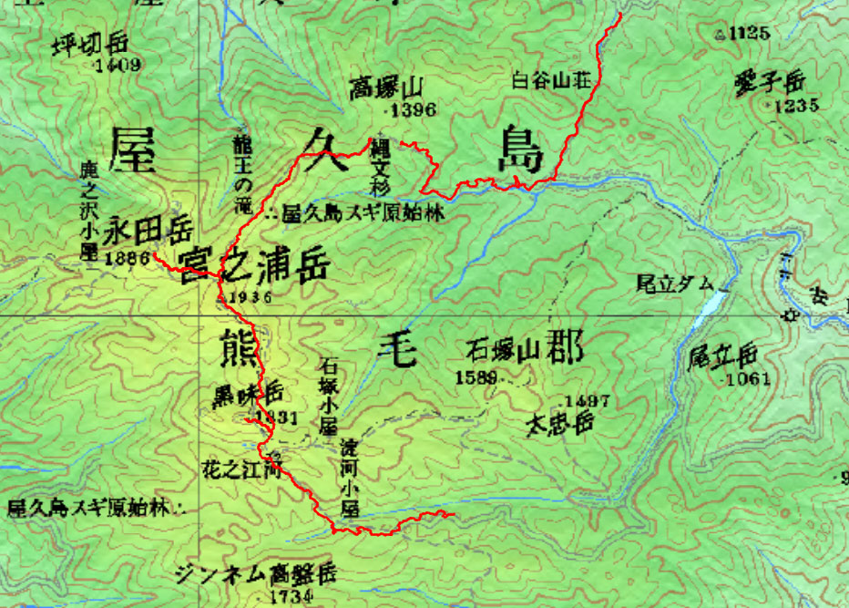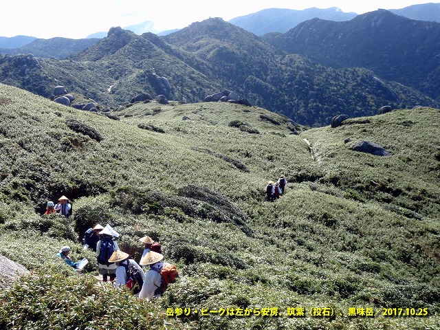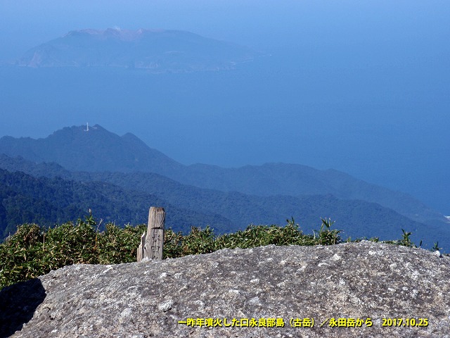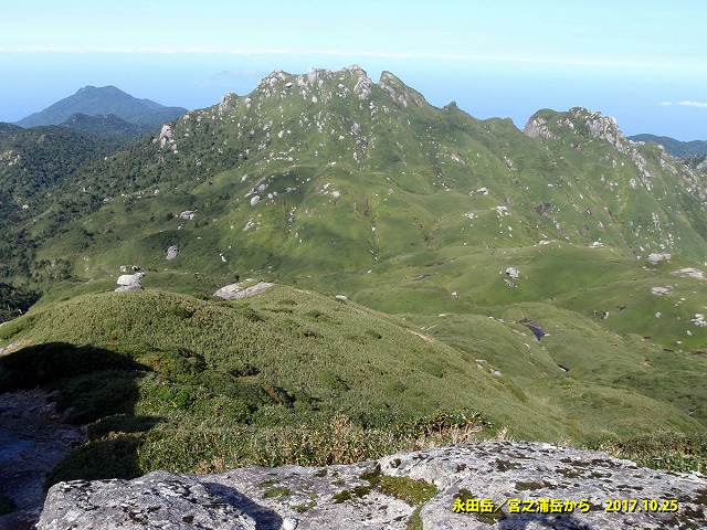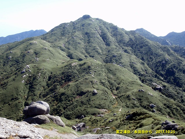 【山域】 屋久島・黒味岳〜宮之浦岳〜永田岳 【構成】 田中秀和 (単独) 計画を立てたのは8月末、混雑と台風回避を狙い11月初めの連休前の格安航空券を押さえた。しかし、行きも帰りも台風に脅かされたしまった。その中で、稜線歩きとなる淀川口〜高塚小屋までは好天に恵まれラッキーであった。 10/23(月) 台風21号が960hPaの勢力を維持したまま東京を通過したのが朝の6時頃。前日から欠航が続いていた羽田発鹿児島行きは搭乗予定便からは運航再開の予定と知り羽田に向かう。 搭乗ゲートが数回変更され、出発遅延の時間がアナウンス毎に長くなった。台風通過後の強風で滑走路は1本のみ供用、当初の予定機は羽田に降りれず伊丹に!2時間半待っての代替機に乗り込むも駐機場から動けず30分経過、静止している機体が時折風で揺れる。 結局、鹿児島空港着は3時間以上の遅れ、振替え手配された屋久島最終便も出た直後。ANAが翌朝一番の便を手配、用意された空港直近のホテルに落ち着く。 明日は予定一部変更、午後の紀元杉行きバスに乗り淀川小屋まで入ることとする。明日も天候はさほど良くなさそう・・・離島の山登り焦っても仕方ない。 10/24(火) 鹿児島空港は雲が多いも晴、屋久島空港は少し重い曇り空、山は雲の中。空港でガスカートリッジを入手、観光案内所にて環境保全金を納め、登山計画書を提出、直近の情報を聞く。路線バスにて安房に出て食糧調達、昼食後バス時刻まで時間があるので自然館まで歩く。 紀元杉のバス終点に降りたのは12〜13人、山のガスは晴れず時折雨粒が落ちる。30分程先の登山口の駐車スペースには5〜6台が駐車、淀川小屋利用者は定員以下に納まりそうで一安心。濡れて滑り易い木の根に注意しながら歩き出す。30分強で清流の辺に建つ立派な淀川小屋に着く。先着者1人、バス組が11人、遅れてガイドツァー8人と単独行1人の計21人が今夜の客。小雨の中、狭いテラスでお互い譲り合って夕食準備と小宴会。 <タイム>→は車など、>>は歩行 鹿児島AP 9:45 →JAC3741→ 9:45 屋久島AP 10:23 →バス→10:42 安房(昼食・買い物)12:30 >> 13:10 屋久島自然館 13:39→バス→14:32 紀元杉(1,240m) 14:40 >> 15:10淀川口(1,360m) 15:15 >> 15:50 淀川小屋(1,380m)・泊 10/25(水) 星が見え隠れする朝、4時前から出発準備で小屋内は騒がしくなる。5時半の出発はもう最終グループ、だが未だ外は暗く暫くヘッデン歩行、予報通りの青空は広がらず朝焼けも暗い。 猿が遊んでいた湿原の花之江河を過ぎ、黒味岳分れはザックをデポする乾いた場所もないのでそのまま黒味岳に向かう。樹林帯から花崗岩の大きな塊が現れるようになり、シャクナゲや草地となって視界が広がり高山らしくなる。黒味岳山頂は大きな岩の上、先程の花之江河や宮之浦岳等々も見渡せるが厚い雲が鬱陶しい。風が吹き出し冷たくなったので雨具を着込む。 黒味岳分れに戻り宮之浦岳を目指すが、雨の島らしく登山道は至る所が小川状態である。8時を過ぎて漸く太陽の光を浴びるようになり、投石岳南の鞍部に乾いた花崗岩の岩棚を見つけ休憩、久し振りの乾いた場所は気持ちが良い。 安房岳、翁岳を巻く小さなアップダウンの続く道も稜線部であるのに湧水豊富である。できる限り泥田の道を避け随所に現れる花崗岩の岩肌を選んでフリクション頼りに歩く。いつの間にか雲が消え快晴状態になり気温も上がってきた。 奇岩と洞が崇敬の念を抱かせる栗生岳を過ぎ、そのまま登り続けること15分で宮之浦岳着。山頂からは永田岳の後には一昨年噴火し島民が全員避難となった口之永良部島と噴煙たなびく古岳(新岳)が望めた。気持ちよい山頂で昼食大休憩、程なく岳参りの一行が到着して賑やかになった。その数は約10人、彼等は宮之浦地区の人々、自薦他薦で選ばれた人が春秋の2回、永田、宮之浦、栗生と三岳を巡るとの由。 草付きの急斜面を下り焼野三叉路にザックをデポ。永田岳直下の鞍部までは草に覆われ足元も見えない道が続くも、岩混じりの急斜面の登りは快適であった。ここから見る宮之浦岳は立派である。 永田集落の海岸線、口之永良部島が見え離島の山を実感する。 焼野三叉路から平石までは草原の中を下り一辺倒、陽当たりの良い場所では本州よりも一回り小さな鹿が草を食んでいる。朝の猿もそうであったが、彼等は近寄ってカメラを構えても一定の間を保ちつつ逃げ出さない。 永田岳や宮之浦岳の好展望台である平石岩屋を過ぎると道は尾根筋を辿る下りとなる。今回と逆に高塚小屋から淀川小屋へと反時計回りに巡る方が眺望的に勝っている・・・公共交通機関頼りでは計画が組み難いのだが。 次第に樹林の背丈が高くなり、夏椿に似たスベスベした木肌のヒメシャラの樹林帯の尾根道から急斜面を降りると湿原の中に建つ新高塚小屋にでた。よく手入れされた小屋には未だ誰も入って居ない。水は豊富、反面湿気が気になる。時間は未だ14時なので新装なった高塚小屋に向かう。 小高塚山を巻くように暫くはダラダラとした尾根道を進