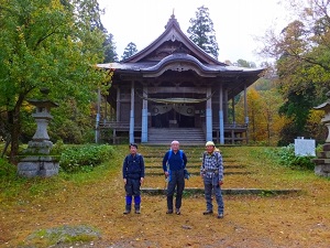 参加者 L:菅澤 M:加瀬、野村、川島 11/3(金・祝日) 晴 浦和IC 9:00==(東北道、磐越道)==三川IC==(県道14号) ==1630二王子神社(泊) 東北道は最初から大渋滞で目的地到着は2時間遅れが見込まれた。特別に神社の拝殿宿泊を許可されていたのだが鍵を開けてもらえるか気がかりになる。約束の16時を過ぎたが管理人(神主さん?)が待っていてくれた。荷物を拝殿に運び上げて急いで食材買出しに新発田に向う。拝殿の前は草地のキャンプ場となっていて、炊事場ときれいなトイレもあった。 二王子神社の拝殿は再建50周年を迎え、記念タオルと神餞の柿をいただいた。捧捨した8000円(4名分)は素泊代と考えよう。高い格天井の拝殿は上段・中段・下段に分かれ、42畳敷きの下段を使わせてもらった。発電機で蛍光灯もつけてもらい快適だったがカメムシが多く、歩くにも気を使った。光源か暗く狭い場所を好む習性のようだ。 夜半に落雷の音と大雨の気配で目が覚めた。 二王子神社