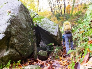 11/4(土) 雨 二王子神社(300m)8:55― 一合目9:20―神子石(580m) 9:40― 二合目9:45― 一王子避難小屋(三合目720m) 10:00―四合目 ―945m地点10:50 ― 一王子避難小屋11:15/11:35―二王子神社12:10/12:30==(県道14号) ==14:10御神楽温泉(泊) 4時30分に起きて朝食を済ませたが、出発予定の6時になっても雨は降り続いている。諦めて一眠りしていたら雨もあがり青空も見えたので急いで支度して8:55出発。ポストに登山届けを入れ、しばらくは沢沿いの気持ちのよい登りが続く。神子石を過ぎ、三合目の避難小屋に着いた。4合目辺りから雨が降り始め、5合目の手前(945m)で本降りとなったので引き返すことにした。この時期の雨は冷たい。避難小屋で休憩して下山した。登山道はよく整備され、濡れた紅葉もきれいだった。 宿へはチェックイン時刻前に着いたがOKで、濡れた登山靴や衣類も乾燥室に運んでくれて助かった。食事も良く、注文したドブロクも旨かった。御神楽温泉の「小会瀬」は和風の本格旅館で風情のあるよい宿だった。9000円は安いと思った。 神子石