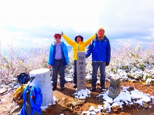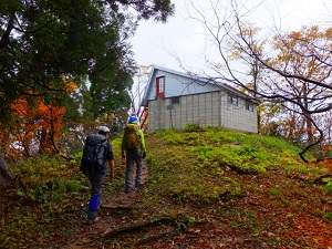 雪庇の出そうな切れ落ちた稜線を少し下り、短い岩稜を一登りで二等三角点のある山頂に到着した。反対側の本名御神楽岳(1266m)へ通じる道が福島県側へ続いている。周囲は全て山に囲まれていて、少し霞んでいるせいか山座展望台で同定できたのは守門岳くらいだった。陽が出て暖かくなるなか黄葉を楽しみながら下山した。 頂上まであと一歩