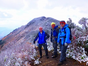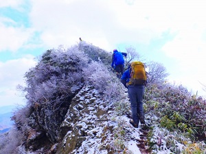11/5(日) 曇り/晴 宿6:00==御神楽岳登山口(310m)6:20/6:30―老木下の沢(560m)―最後の水場(925m)―大森(1150m) 8:30/8:40―しゃくなげ通 り9:30―雨乞峰(1356m) 10:00―御神楽岳(1386m)10:10/10:30―しゃくなげ通り10:50―大森11:00/11:20―最後の水場―老木 下の沢―御神楽岳登山口13:15/13:40==宿14:00/14:50== 津川IC==21:00浦和IC 昨晩用意された大きなおにぎりで朝食を済ませて出発。 常浪川沿いを走り「登山口」の標識を左折して橋を渡り、林道をセト沢沿いの登山口へ。先着車が5台あったが山中で出会ったのは3人だけだった。ポストに登山届けを入れて沢沿いに登り始める。小沢を渡った中間尾根から沢の源頭を右手の山腹に上がってまた沢を渡る。ブナの大斜面はおおむねなだらかだが、ぬかるみが多い。積雪期は大森までルートを見失わない注意が必要と感じた。 最後の水場でまた沢を渡り、大森で小休止。気温が下がってきたので雨具をはおり、雪を被った笹を掻き分けながら「しゃくなげ通り」といわれる稜線に出ると展望が開けた。薄らと雪をまとった山肌がとても綺麗で、雨乞峰の右手に御神楽岳の鋭鋒が見えてきた。 小さな石の祠を過ぎるとすぐ雨乞峰に到着。東面の磨かれたスラブ帯が大迫力である。スラブ帯の上部を北東に延びている蝉コースはかなり険しそうなルートに見えた。あとで上川村の登山マップを見たら「転落注意」とされる場所が20箇所も表示されていた。 雨乞峰