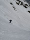 背後の雪面は割れている。雪がつながっている急峻な斜面を選び入る