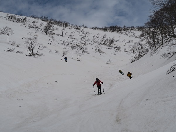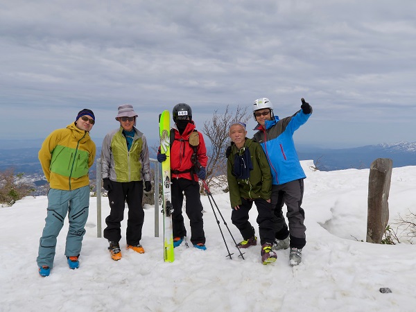 メンバー:立田、樋渡、たまちゃん、いっち−、上原 4月13日(金) 中野坂上 21:00 → 小出IC → 道の駅いりひろせ 1:00 テント泊 新人の上原です。今回、山行に初参加しました。これからよろしくお願いします。 小出ICを日が変わった直後に通過。IC付近にはコンビニが開いており、食糧の調達には問題がありませんでした。天気は非常に良く、星がとてもきれいでした。 道の駅にテントを張り、就寝。 4月14日(土) 5:30起床 →二分集落408m 6:15 >> 保久礼小屋 8:10 >> 守門大岳1432m 0:30-11:30 〜 下山 13:30 二分集落の除雪終了点から入山。ウェーダーを来た釣り人が2人川沿いを先行していき、春を感じた。スキー目的の車は我々も含め5、6台程度。 車道を通りながら徐々に標高を上げていく。保久礼小屋に上がるまでは何も考えず付いて行けたが、ここから経験不足、体力不足が露呈していく。自分としては速いペースなのに着込み過ぎて体温調節がうまくできず大量に発汗。シールの登りに慣れず無駄な動きで足を使ってしまった。慣れれば大した傾斜ではないのかもしれないが、前に出した脚が戻って来てしまうのに焦ってしまい、慌ててついていこうとするうちに足が攣ってしまいスローダウン。大岳の頂上直下でやっと少し持ち直し、なんとか大岳の上まで登れた。水も飲みきってしまったのですが、立田さんがくれた三ツ矢サイダーがこの世のものとは思えないほど美味しかったです。 たまちゃん、樋渡さん、いっち−は袴岳へ向かえるか検討しておられたが、登り返しの雪のつき方、雪庇の状況などを見て進むのを断念。麓へ全員で引返すことに。 保久礼小屋へ向かう沢へ滑降したが、滑降地点の数メートル先にある雪庇の亀裂や、先をいくメンバーの横で切れている稜線など、ゲレンデでは決して見られない景色に感動(しているが精神的に参っているため無言)。小屋まで安全を確認しながら降りる。山頂で会った登山者の方とも話しながら、楽しく降りてくることができた。登って来た道と違う地点に下りたが、スキーブーツを木の枝で滑らせてしまって転倒してしまった。車道を戻って駐車地点が見えた時は本当にホッとした。 その後の反省会で自分が気付いていなかった課題もいただき、終わってみればとても充実した1日でした。自覚症状もある課題(体重)もケアして早く一人前になれればと思います。メンバーの皆さん、ありがとうございました。 (写真:守門大岳山頂)