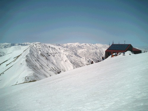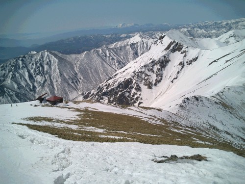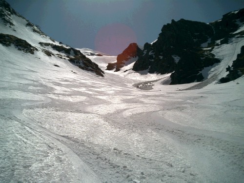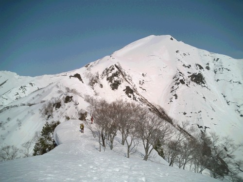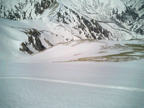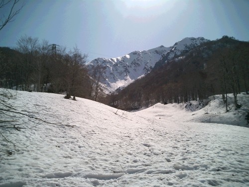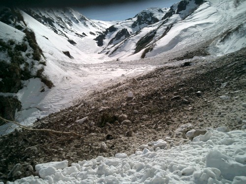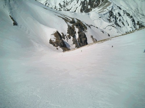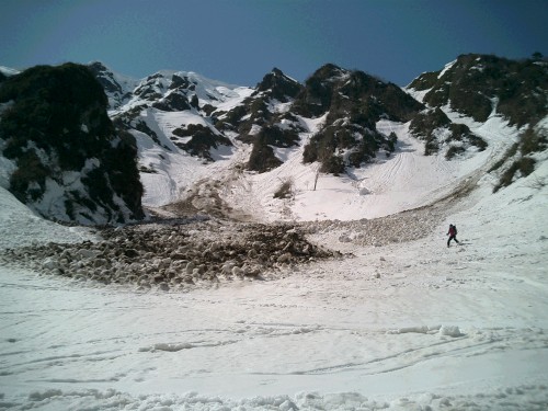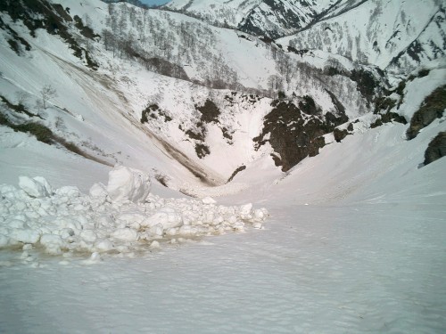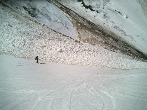 芝倉沢中間より下部。雪質は湿雪。デブリが出始める。S字のところは武能岳からの雪崩後が黒い。