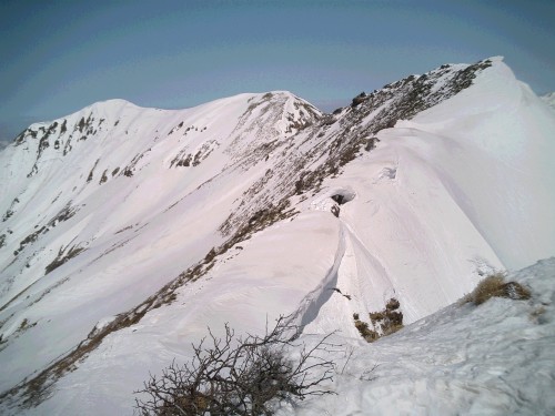西黒沢にクラックのひだが見える。西黒沢も雪崩が一筋出ていた。