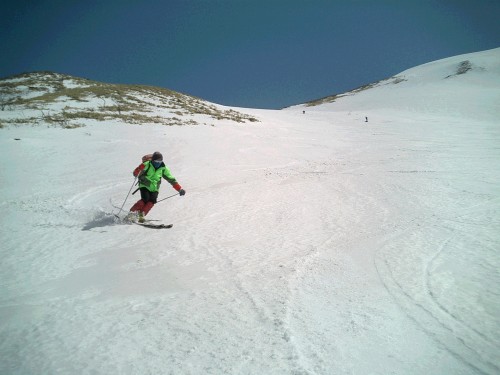 芝倉沢源頭部下部の滑降。この辺は滑りやすい雪質。